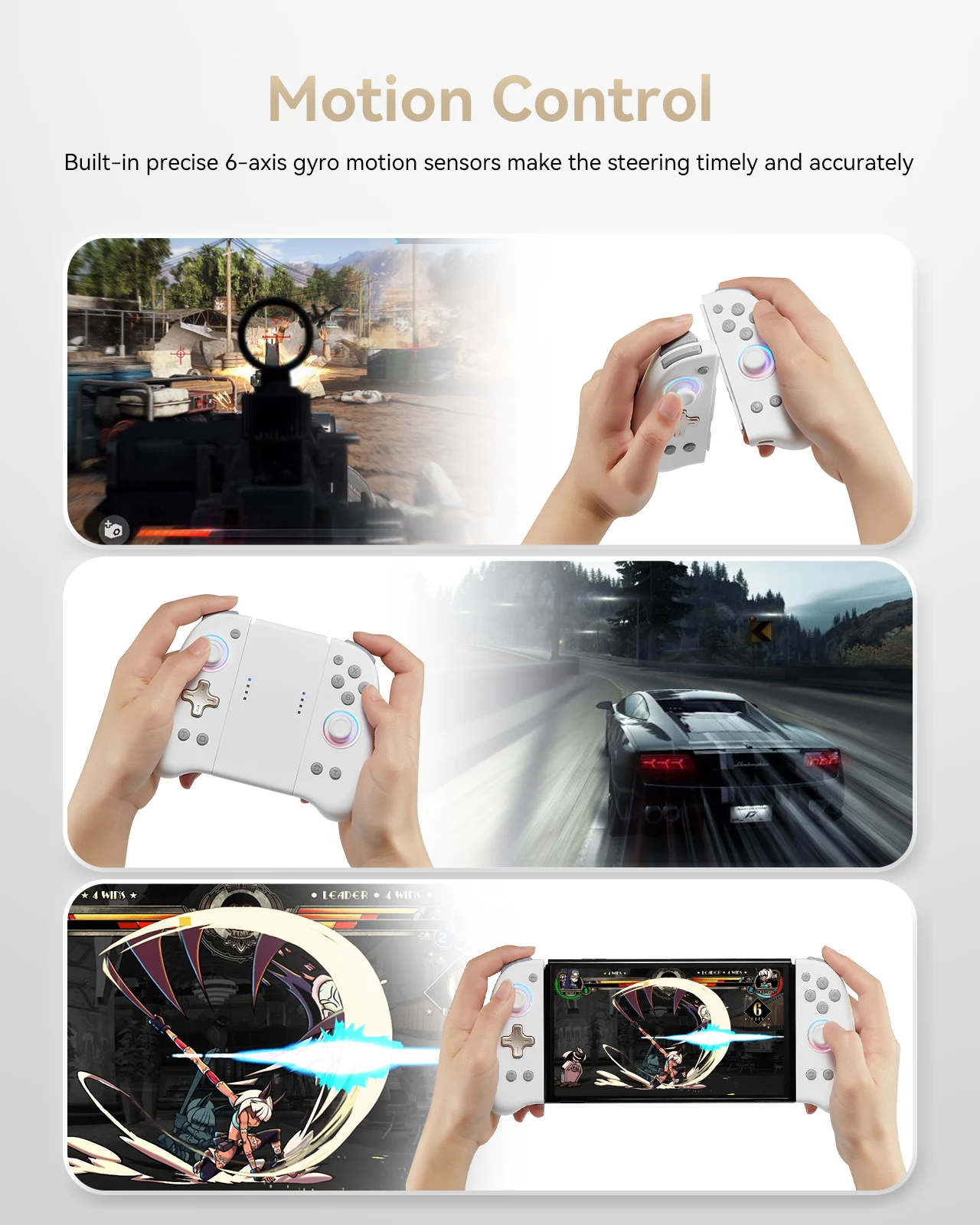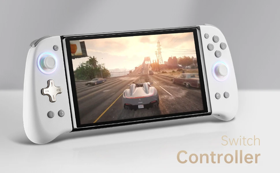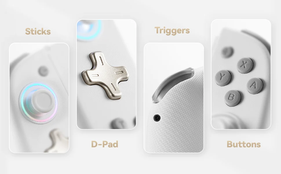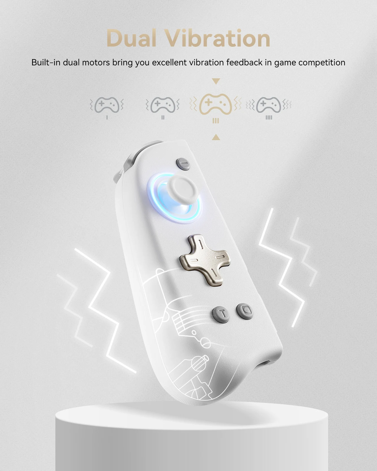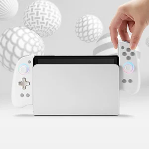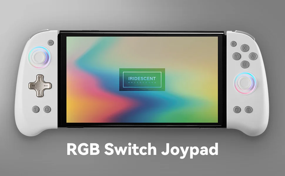 [RGB colorido] Aspecto blanco, gris y dorado en este interruptor Joycon, extremadamente llamativo.Anillo de luz de siete colores y tres modos de iluminación monocromático, respirable y arcoíris para que puedas personalizar tu joypad especial.