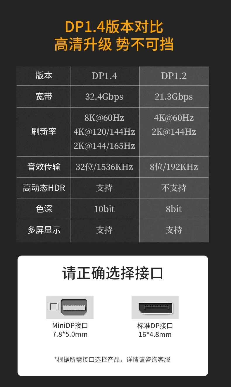 3.DP1.4 admite una resolución de hasta 8K@60HZ, 7680*4320, la resolución es cuatro veces mayor que la de 4K y la resolución de los ojos humanos es 4,3 veces mayor que la del ojo humano sin sentirse granulado a corta distancia.