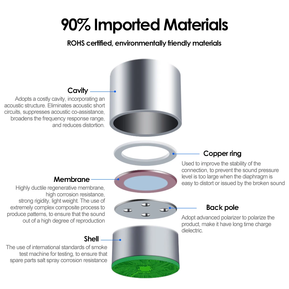 3.Rendimiento de audio premium:Actualice su micrófono con núcleos de micrófono de condensador electret que ofrecen un alto rendimiento en cualquier entorno.Perfectos para salas de conferencias, conferencias o entornos de sonido enfocados, estos núcleos garantizan que su voz se escuche con claridad y precisión.