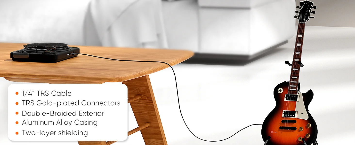 Este tipo de cable es la mejor opción para guitarristas, teclados y bajistas. Debido a su amplia compatibilidad y flexibilidad, es adecuado para cualquier dispositivo de audio que utilice un conector de 6,35mm o 1/4 pulgadas. Además, este cable está hecho de PVC de alta calidad y respetuoso con el medio ambiente, que es duradero y garantiza un uso a largo plazo. Puede guardarlo fácilmente en cualquier lugar sin preocuparse por los nudos y enredos.