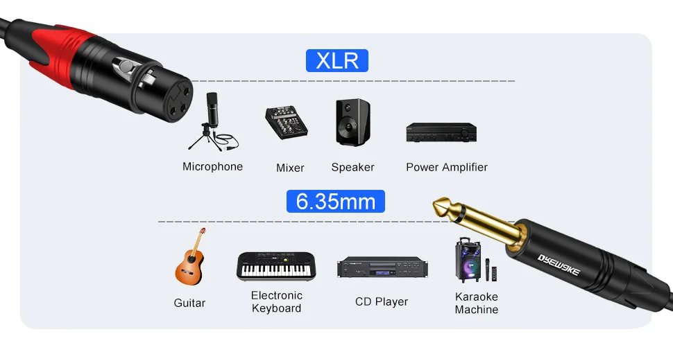 Funciona con algunos dispositivos con conector XLR hembra a TRS de 6,35mm, como micrófonos, consolas de sonido, amplificador de potencia, sistema estéreo, receptor de micrófono inalámbrico y más.