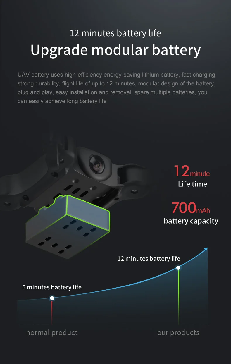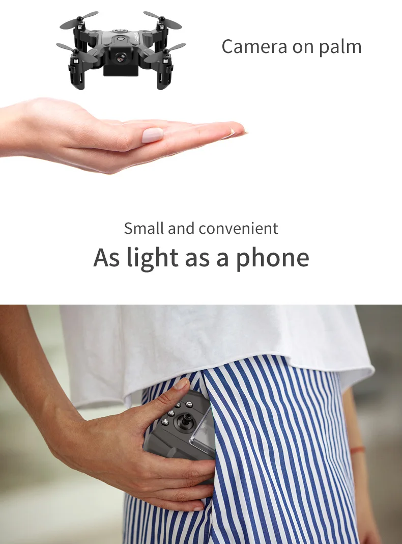 Adelante, atrás, girar a la izquierda, girar a la izquierda, volar hacia la derecha, rodar con un clic, rodar con patrón de 360 grados, modo sin cabeza sin brújula, regreso al vuelo con un clic y fácil recuperación. Control WiFi móvil, transmisión en tiempo real de pantalla móvil, modo de altitud fija, vuelo/voltaje estable, aterrizaje estable Cuerpo plegable, tamaño pequeño, fácil de transportar, función de temporizador automático, nuevo innovador modo de fotografía aérea