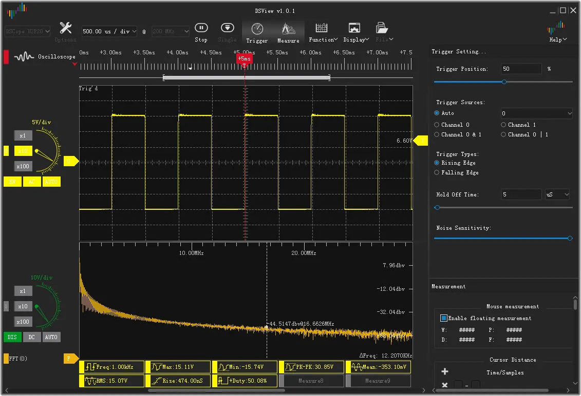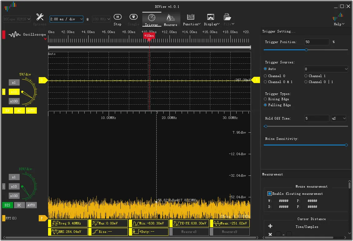 El análisis de espectro en tiempo real basado en FFT tiene controles de longitud de FFT (1k-16k), intervalo de muestra, ventana FFT (Rectange/Hann/Hamming/Blackman/Flat_top) y modo de eje Y.