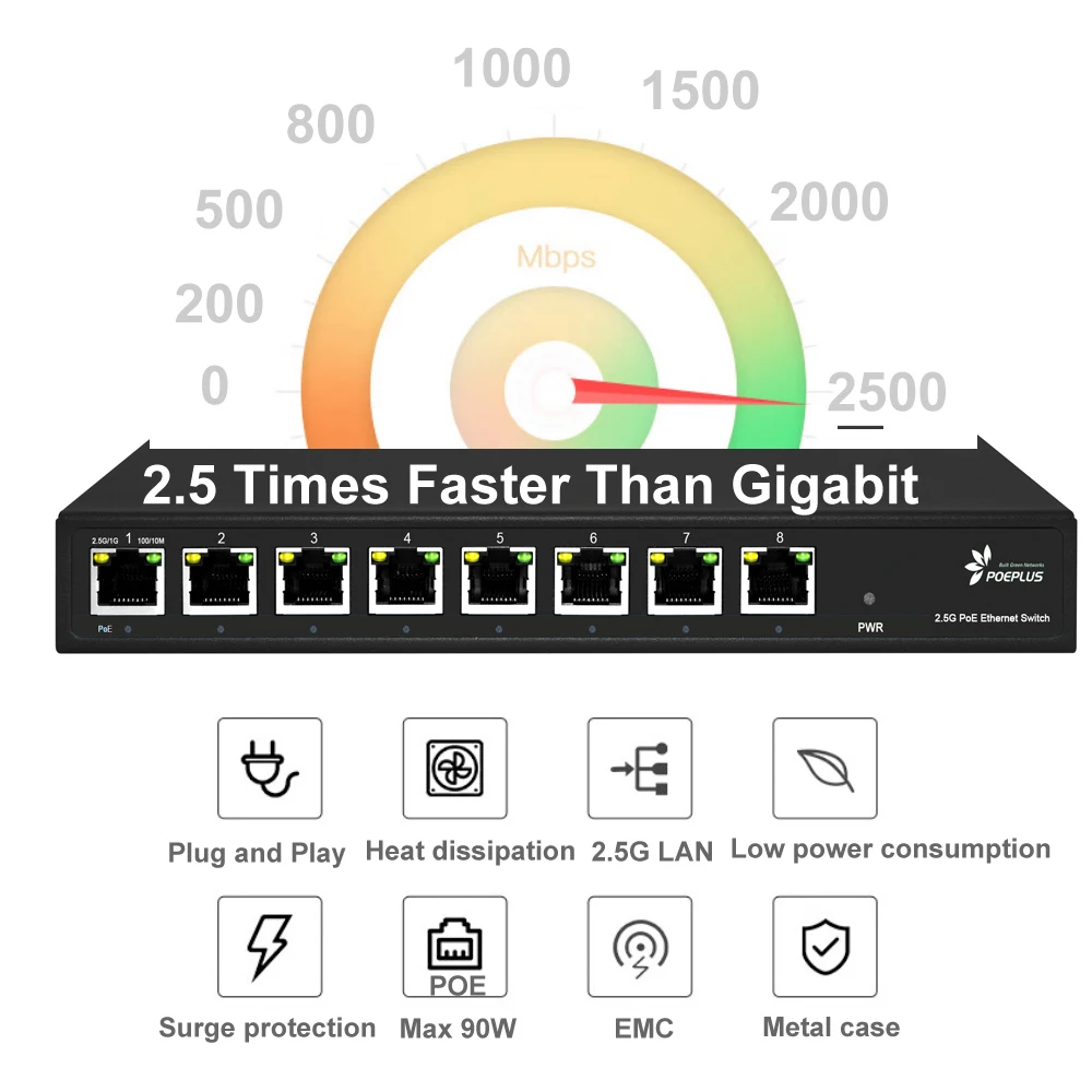 Se trata de un conmutador POE no gestionado de 8 puertos 10M/100M/1000M/2,5G autoadaptativo. Proporciona 8 puertos de salida POE activa. El primer puerto admite Salida de 802.3bt max 90W,Y los puertos 2-8 cumplen con el estándar 802. 3AF/AT. Utiliza el mecanismo de almacenamiento y reenvío e integra caché de alta capacidad para garantizar el reenvío de velocidad de línea sin bloqueo en todos los puertos. Por lo tanto, es adecuado para aplicaciones de gran ancho de banda.