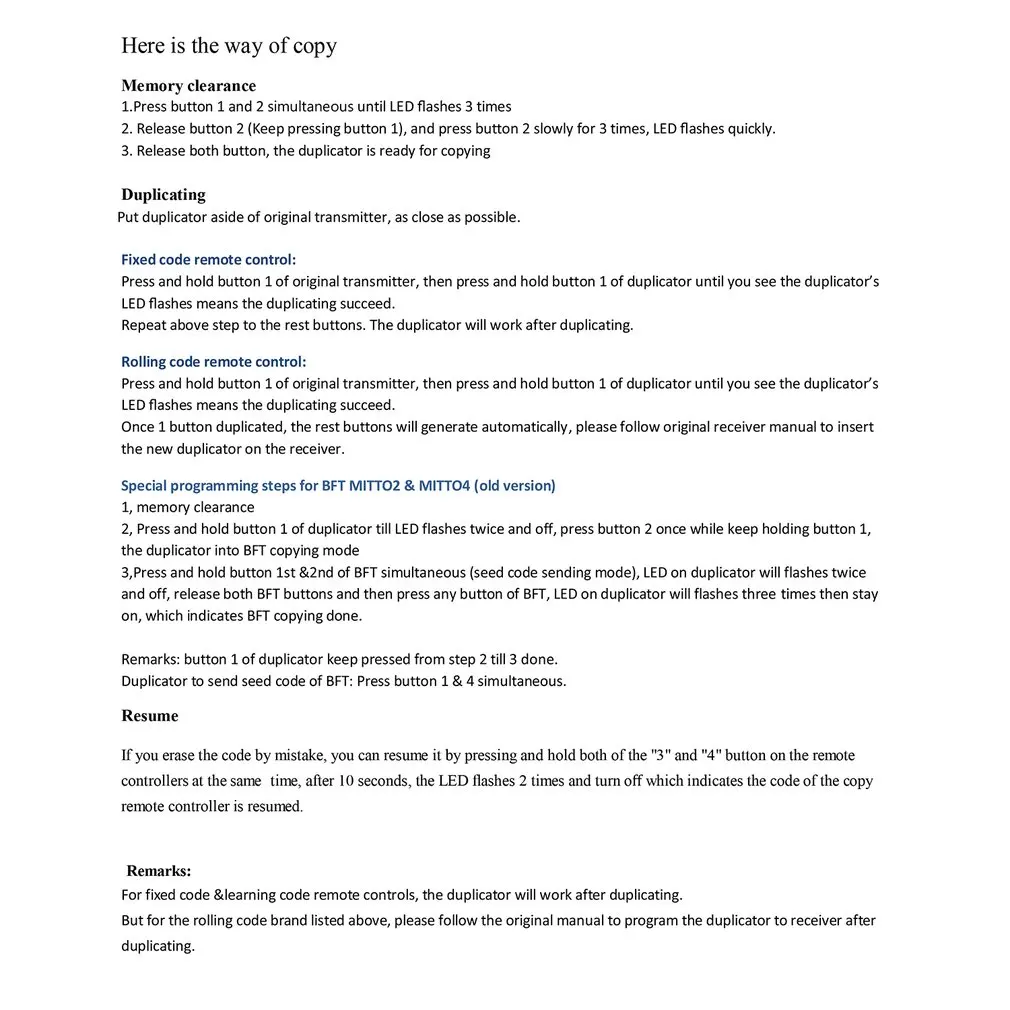 El control remoto inalámbrico 433mhz control remoto de copia de código rodante es diferente al control remoto de copia anterior. Es compatible con BFT MITTO2 MITTO4 (versión antigua), BENINCA para ir WV, DOORHAN TX4, NICE FLORS, V2, vivoferm, FAAC XT4 433RC, para KEY TXB-42R, para ATA PTX4, para GBD AU1600, para nice-smilo, para ROSSI, para MotorLine MX4SP DSM, Para DEA MIO TR2, para Peccinin TX3C, para centurion-nova, para un MOTOR AT- 4 FADINI JUBI, para Hiland.