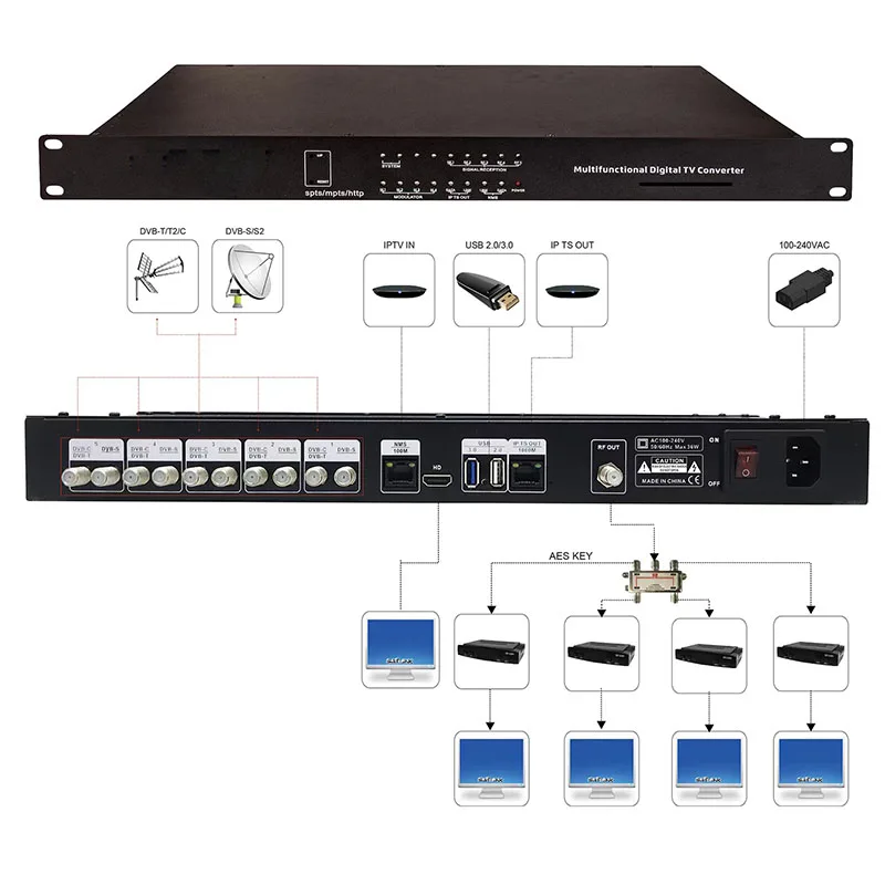 Admite señal de RF de isdbt opcional DVB-S2/T2/C (cualquier dos combinaciones) de entrada, salida de señales de multidifusión DVB-T/ISDBT DVB-C e IP (rtp, udp) y señales de http de unicast, admite acceso de irdeto (Ideide), NDS, Nagravision, Francia Twitterracess, CA descrambling es compatible para irdeto acceso (Ideide), NDS, Nagravision, Twitterracess (Francia), Conax (NTenga en cuenta que no todas las versiones de cifrado son compatibles, ya que existen muchas versiones de cada sistema de cifrado.