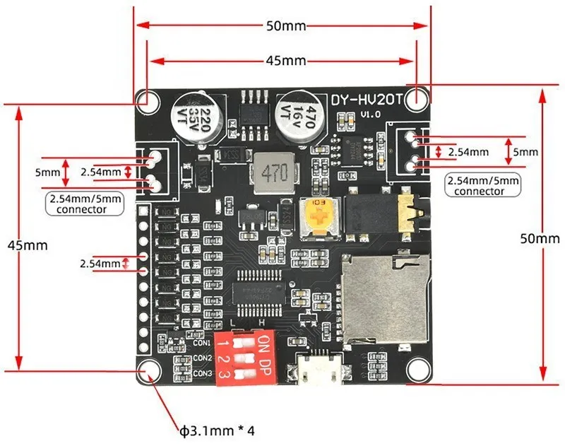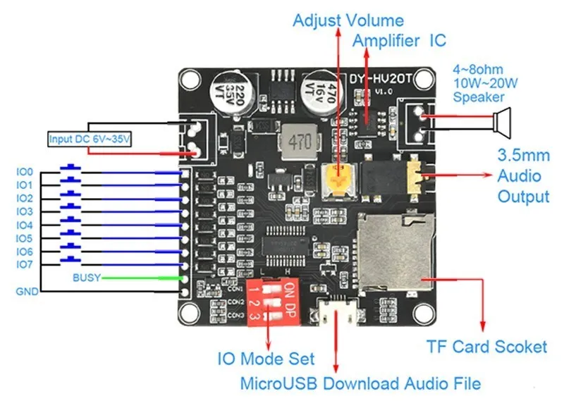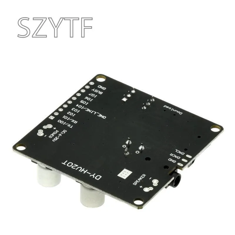 DY-HV20T es un módulo de reproducción de voz inteligente, disparador de segmento IO integrado, control de puerto serie UART, control de puerto serie de bus único ONE_line, MP3 estándar y otros 7 modos de trabajo, configuraciones simples de interruptor DIP;Amplificador de potencia Clase D de 20W integrado;Admite formato de decodificación MP3,WAV, puede admitir tarjetas TF de hasta 32G, se puede conectar a la computadora a través de un cable de datos USB, actualiza archivos de audio de almacenamiento TF.