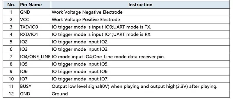 7, función de transmisión de voz de control de puerto serie UART, puede controlar la reproducción, pausa, selección de música, aumento o disminución de volumen y otras funciones, la selección máxima de 65535 pistas, velocidad en baudios de 9600 bits/s.