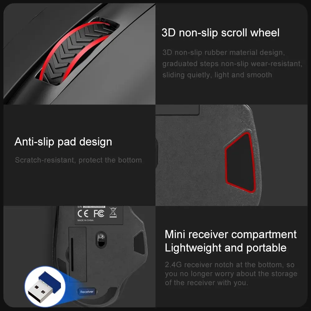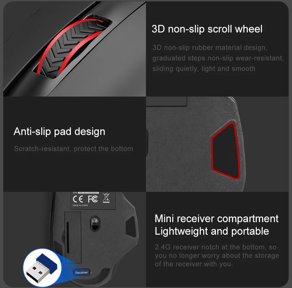 USB Plug And Play & Stable Cursor: Receptor Nano USB se puede almacenar en la parte posterior del ratón, plug and play.2.4GHz La tecnología inalámbrica proporciona una conexión fiable, distancia de transmisión de hasta 33 pies (10m), que eliminaba los retrasos, las interferencias y proporcionaba una transmisión de datos rápida.