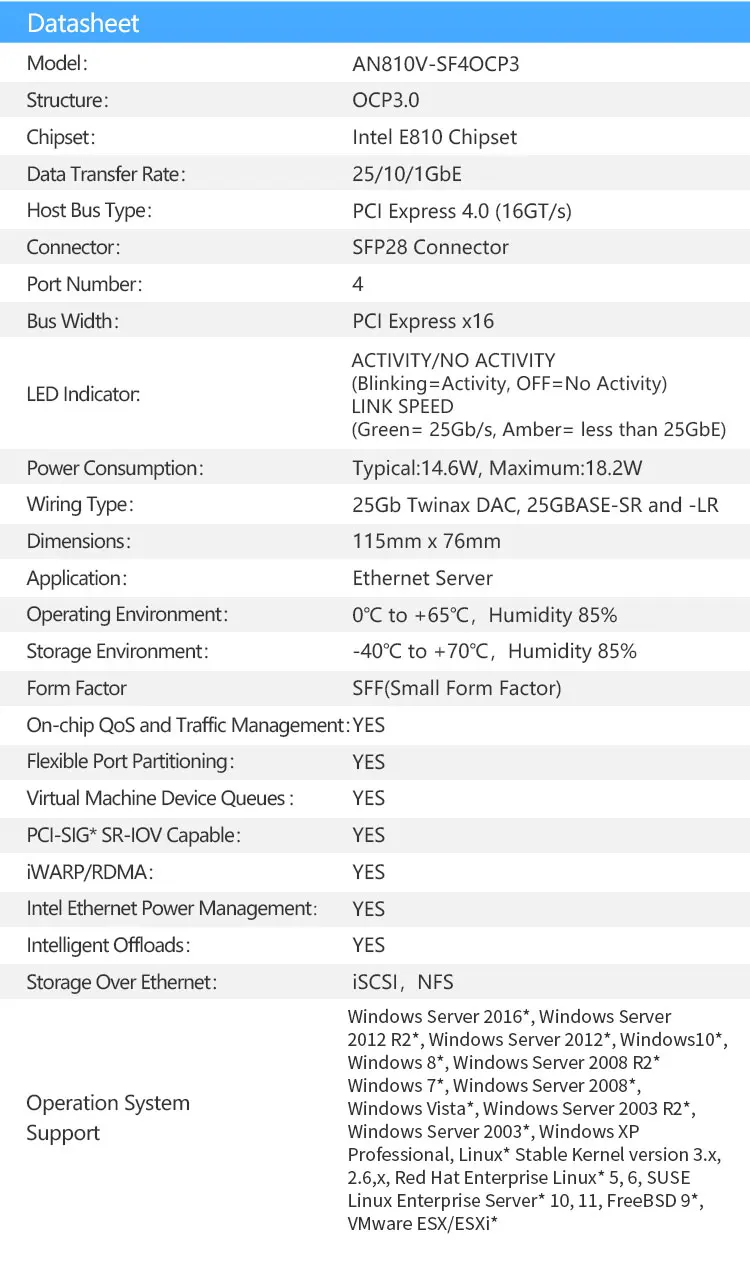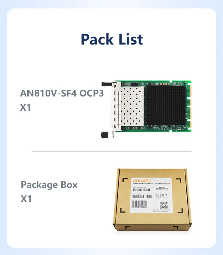 CEACENT AN810V-SF4 OCP3 is a 4-port 25 Gigabit fiber server adapter based on the Intel E810 CAM1 chipset, independently developed by Ceacent Electronics Limited. The design of this server adapter card is aimed at optimizing rack equipment for servers and high-end open computing projects (OCP). It has four fully independent SFP28 fiber ports, providing unparalleled features for server and network virtualization to meet the needs of the next generation of data centers. It helps promote more efficient server design and practice, handling specific and challenging workloads.