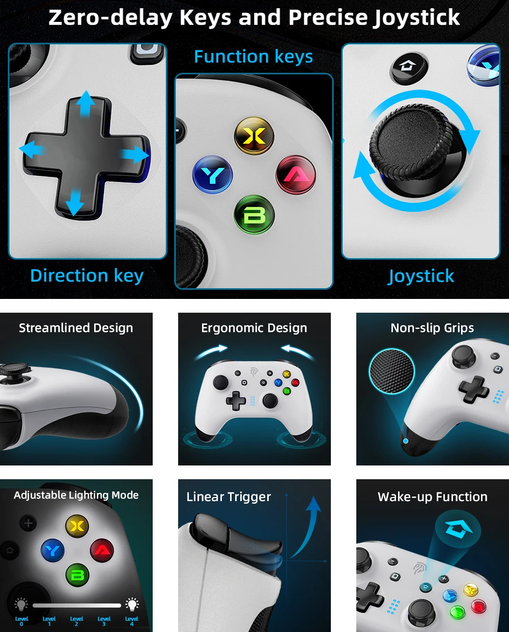 La impresionante retroiluminación LED de colores en los botones ABXY brilla incluso en la oscuridad. Tiene niveles de 0 a nivel 4, 5 niveles de brillo, en comparación con el controlador tradicional, ¡Es más genial!