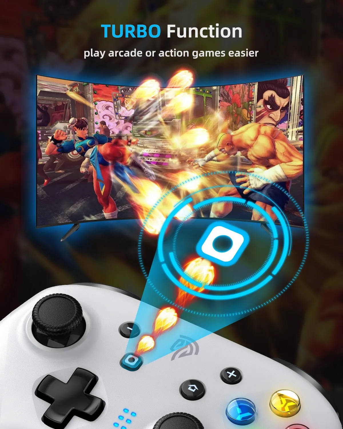 La primera vez que use este controlador Nintendo Switch Pro, debe presionar el botón "X + Home" para conectarse, Y la próxima vez solo necesita presionar el botón "Inicio" para encender su dispositivo e iniciar el juego. Este controlador de interruptor también tiene función Turbo, y puede personalizar el botón Turbo como desee, lo que facilita ganar un juego de arcade o acción.