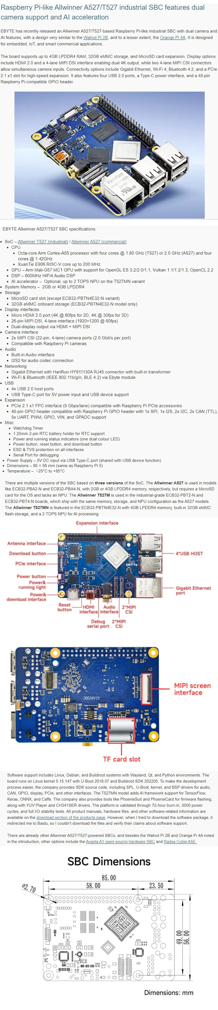EBYTE A527/T527 SBC industrial: cámara dual 4K, IA, 4 GB de RAM, GPIO compatible con Pi