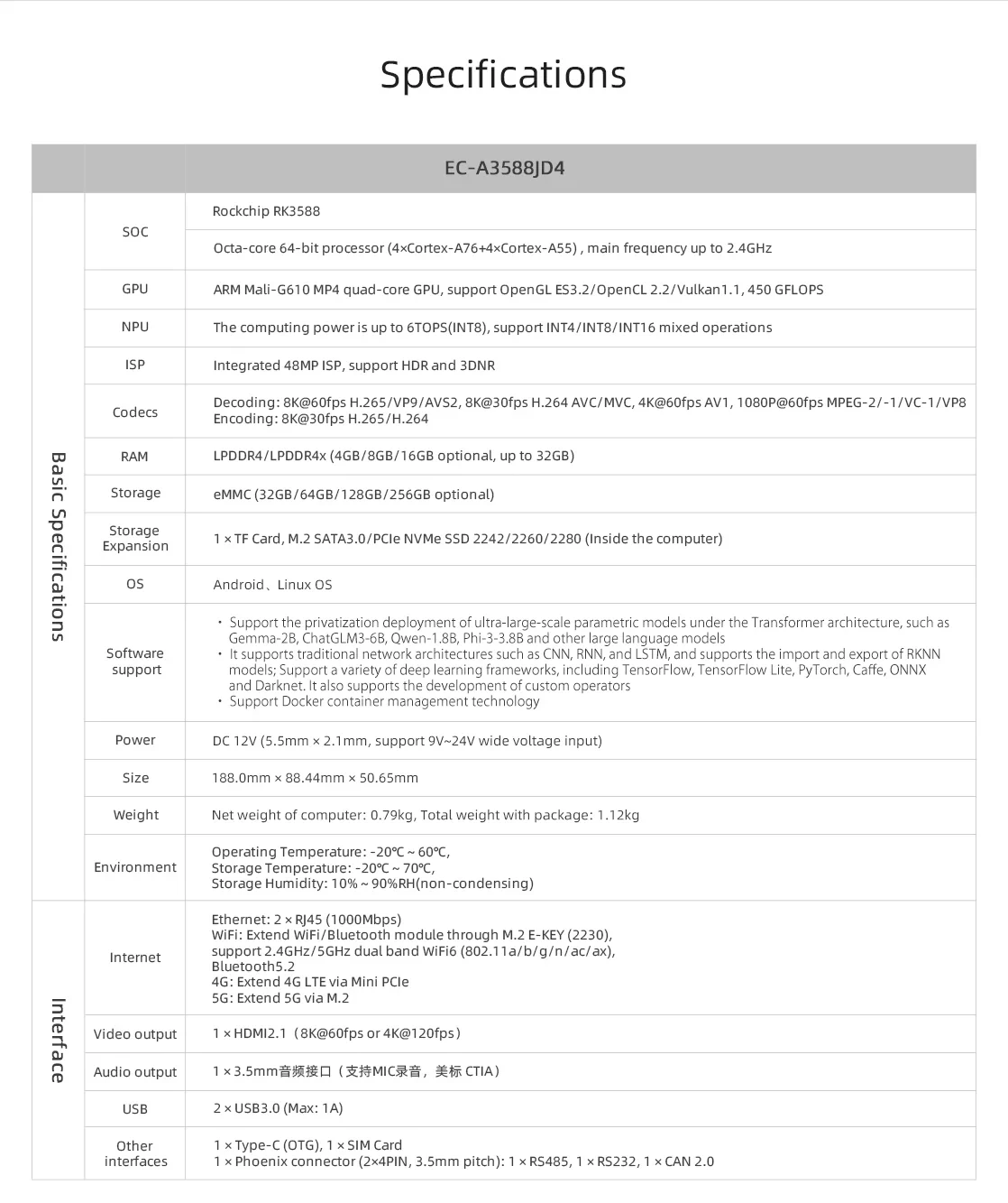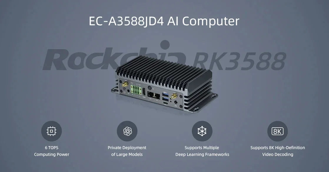 EC-A3588JD4 6TOPS AI Host modelo grande 8K decodificación computación de borde Ruixin Micro RK3588 AI ordenador 6 TOPS NPU 8K Android, sistema operativo Linux