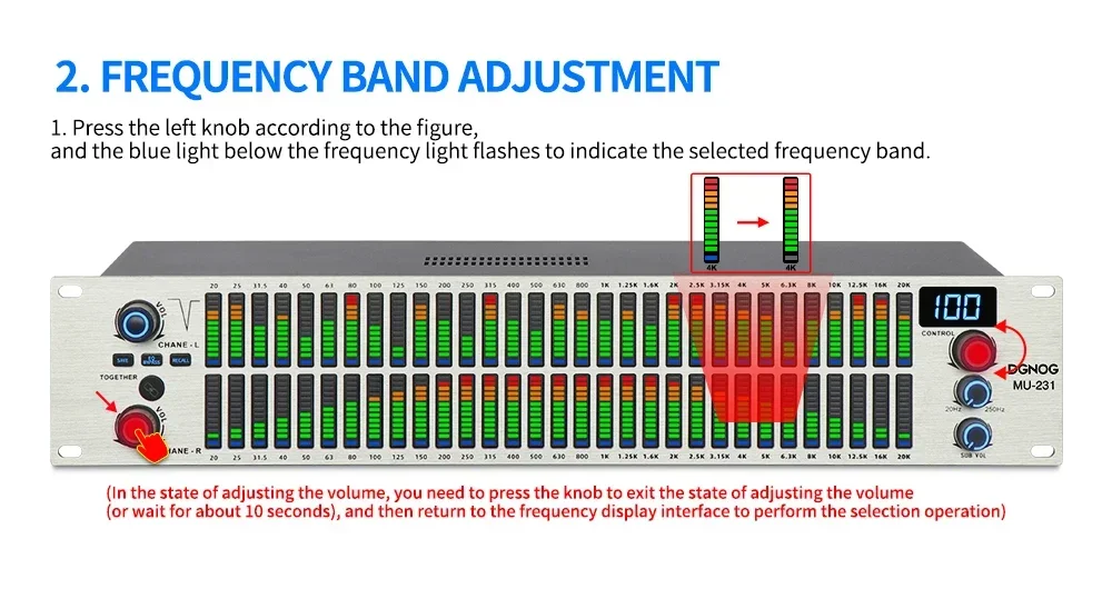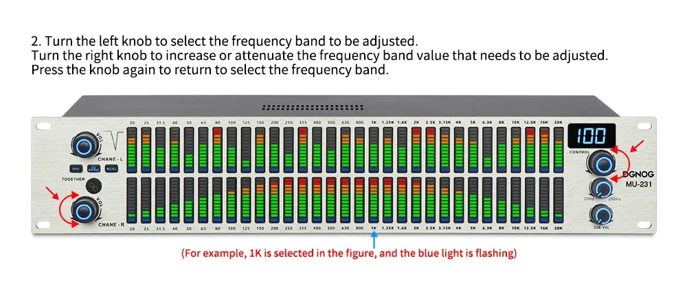 Toque: ajuste los parámetros de ecualización del canal L (20-20 K Hz).La luz azul de la banda de frecuencia correspondiente parpadeará, use la perilla CONTROL para aumentar o disminuir.