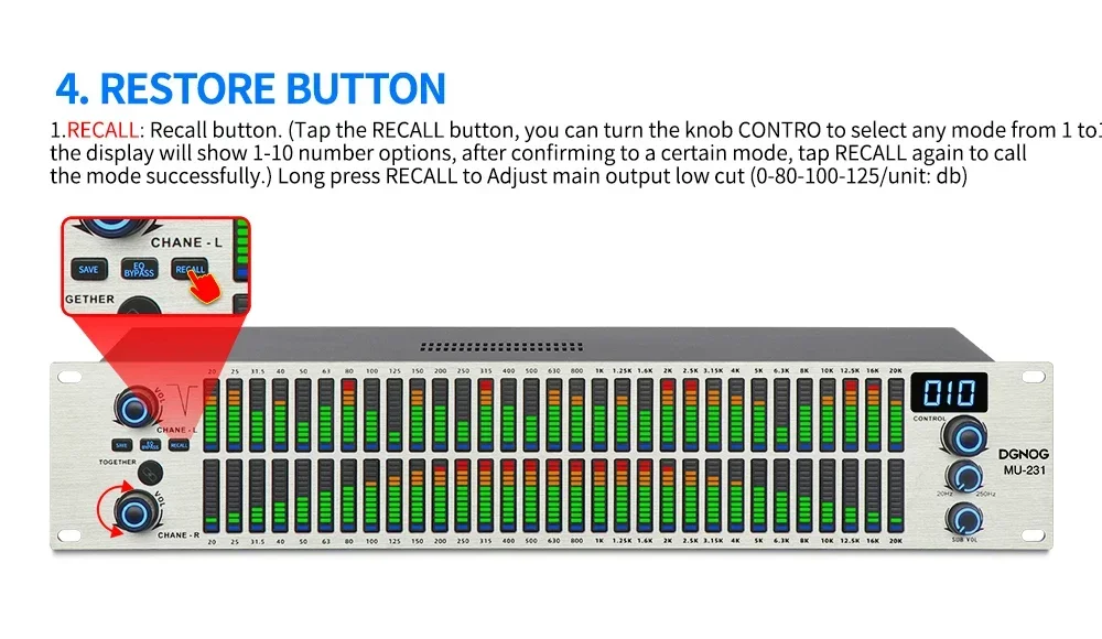el modo correctamente).Mantenga presionado RECALL para ajustar la salida principal de corte bajo (0-80-100-125/unidad: db)