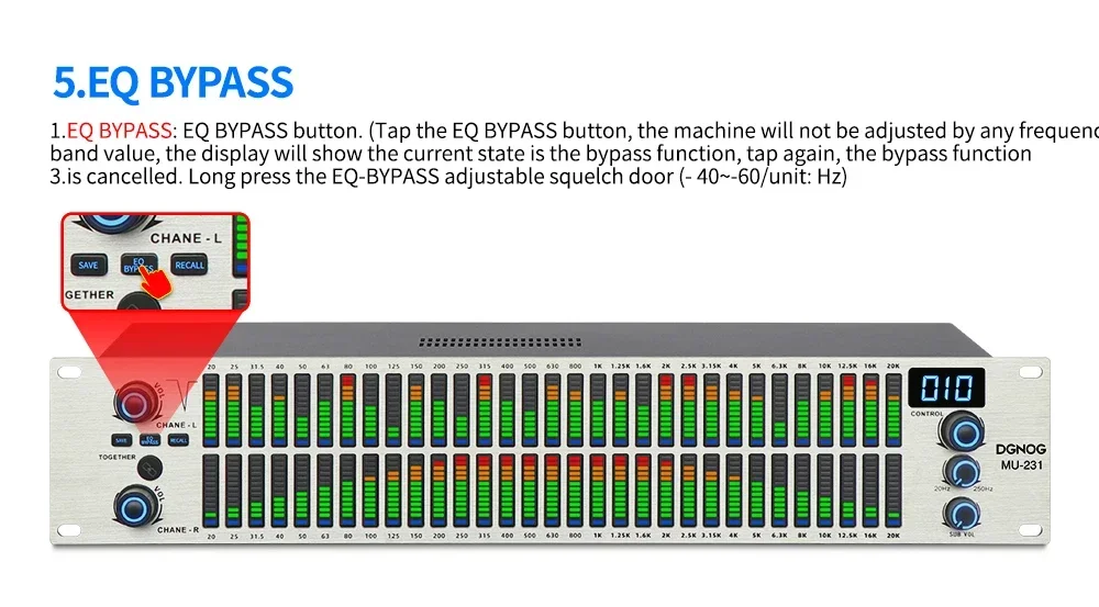 1.EQ BYPASS: botón EQ BYPASS.(Toque el botón EQ BYPASS, la máquina no se ajustará en ninguna frecuencia