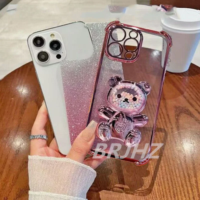 Lindo soporte de oso + cubierta a prueba de golpes + revestimiento transparente con purpurina