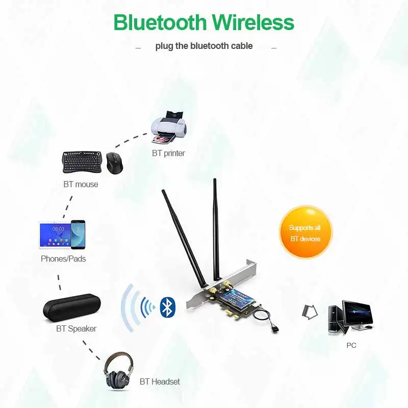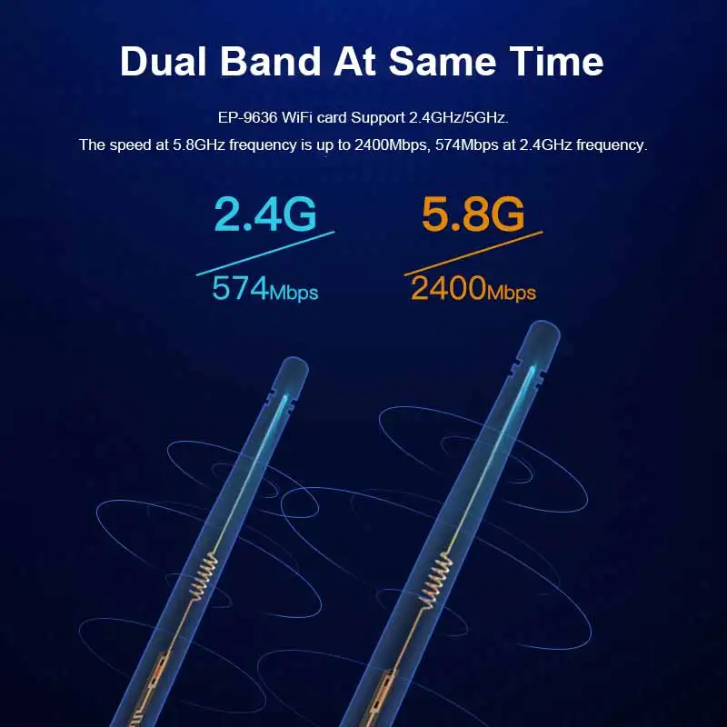Especificación:Marca: EDUPModelo: Adaptador Wifi para PC EDUP 3000M PCI-EChipest: Conjunto de chips Intel AX200Nuevo Wi-Fi 6 con Blutetooth 5.1IEEE estándar: 802.11ax/ac/a/b/g/nDoble banda 2,4 Ghz-600 Mbps/5 Ghz-2400 MbpsSoporte:MU-MIMOSistemas operativos: Microsoft Windows 10, 64 bits solo en plataforma Intel, no es compatible con AMD.Compatibilidad con: Casi computadora con interacciones PCI Express (ranura PCI-E 1X/4X/16X)Nota:1.Velocidad de hasta 2400Mbps (el enrutador debe admitir 802.11ax)2.Debe insertar el cable de alimentación en la interfaz de 9 pines de la placa base para la función Bluetooth. 3.Bluetooth se actualiza actualmente a la versión 5.1 Saber lo siguiente le brindará una mejor experiencia con el producto.1.Sólo para escritorio.Es necesario conectar un cable de alimentación bluetooth a la interfaz de 9 pines de la placa base, o la función bluetooth no funcionará.2.La especificación de este adaptador USB inalámbrico es 3000 Mbps (2,4 G: 600 Mbps, 5 G: 2400 Mbps).Un enrutador con 3000 Mbps o más puede maximizar el rendimiento de nuestro adaptador wifi PCIE.3.Este dongle Wi-Fi no aumentará la velocidad del enrutador original, lo que solo ayudará a su computadora a recibir la señal del enrutador y a acelerar mejor.4.No tiene nada que ver con la calidad de este adaptador cuando no puedes conseguir la velocidad máxima.El entorno de red, el enrutador, las barreras, la memoria interna de la computadora portátil y la PC... la interferencia de muchos factores puede afectar la velocidad.5.Apague el Wi-Fi incorporado cuando lo use en una computadora portátil.(Si hay función Wi-Fi incorporada en su computadora portátil).El paquete incluye:1 adaptador WIFI de 1900M1 * accesorios para tornillos1 * Cable Bluetooth1 * unidadCD