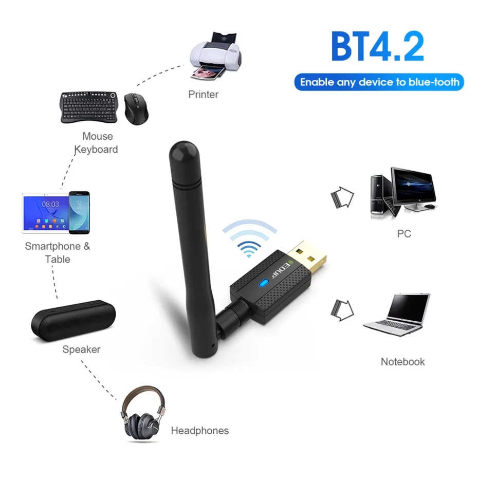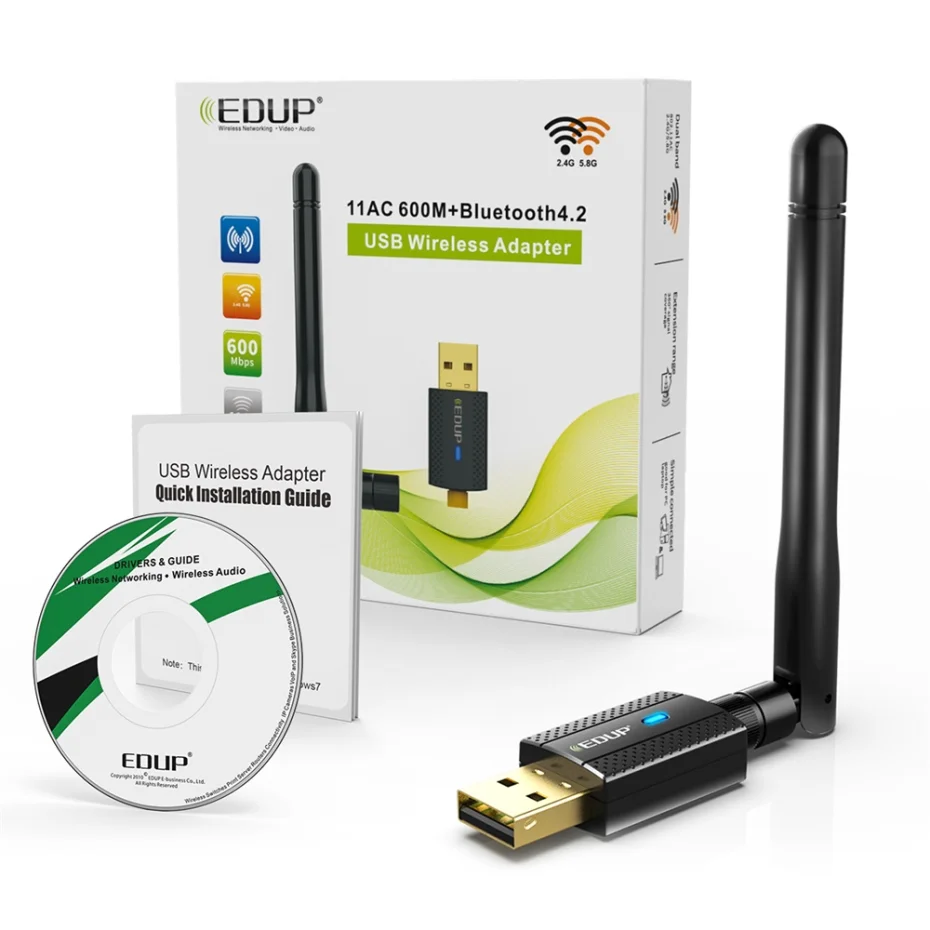 Puntas cálidas:1. Este dispositivo puede enchufar y usar para Windows 102. los controladores para PC Instale (controlador WiFi y controlador Blue-Tooth)3. Cuando use un adaptador wifi para su computadora portátil, apague el Wi-Fi incorporado si su computadora portátil tiene Wi-Fi incorporado.4. La Compatibilidad y estabilidad de conexión del puerto USB trasero del PC es mejor que el puerto USB frontal. Por lo tanto, le sugerimos que lo inserte en el puerto USB posterior de su PC.5. Este adaptador WiFi no aumentará la velocidad del enrutador original, solo transmite la señal WiFi.La Función de diente azul no funciona con Windows XP, Linux y Mac OSEs necesario instalar el controlador WiFi y el controlador Bluetooth para PC ; Plug and Play para Windows 10Compatible con Windows 11 /10/8,1/7 / XP / Vista / Mac OS 10,6-10.15.3Saber lo siguiente le dará una mejor experiencia de producto.1. La Especificación de este adaptador USB inalámbrico es de 600Mbps (2,4G: 150Mbps, 5G: 433Mbps). Un enrutador con 600Mbps o superior puede maximizar el rendimiento de nuestro adaptador wifi USB.2. No tiene nada que ver con la calidad de este adaptador cuando no puede obtener la velocidad máxima. El entorno de red, el enrutador, las barreras, el portátil y la memoria interna del PC... la interferencia de muchos factores puede afectar la velocidad.3. Conecte el dongle Wi-Fi a los puertos USB detrás del host del ordenador si tiene un escritorio. De esta manera, el dongle Wi-Fi obtendrá suficiente energía.4. Este dongle Wi-Fi no aumentará la velocidad del enrutador original, lo que solo ayuda a su computadora a recibir la señal del enrutador y acelerar mejor.5. Desactiva el Wi-Fi incorporado cuando lo uses en un ordenador portátil. (Si hay una función Wi-Fi incorporada en su computadora portátil).6. Si tu adaptador wifi no está disponible de repente, abre el "Administrador de dispositivos" de tu ordenador para comprobar si el controlador está desactivado.Artículos del paquete:1 * EDUP USB adaptador de Wi-Fi Blue-Tooth1 disco CD (controlador Wi-Fi y Bluetooth)1 * Manual de usuarioAntena 1 * 2dBi Comprar EDUP-Adaptador de doble banda 600G/5Ghz para ordenador portátil, receptor de tarjeta de red inalámbrica, USB, WIFI, Bluetooth 4,2, 802.11b/n/g/AC, 2,4 M