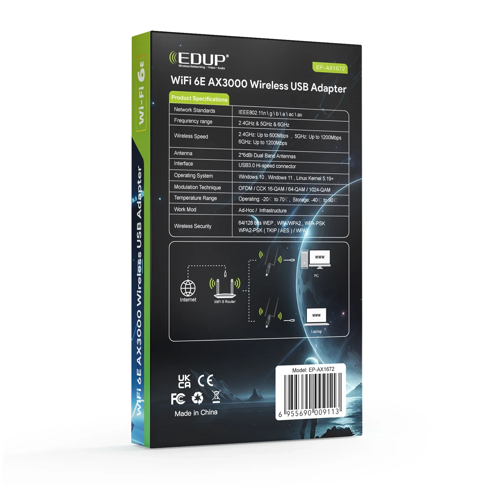 Este producto es un adaptador de red con módulo WiFi6E, que funciona en tres frecuencias (2,4 GHz,5 y 6GHz), con alta velocidad de datos y Módulo incorporado para una recepción de señal más fuerte. Es compatible con varios sistemas operativos Windows y es compatible con varios estándares WiFi.