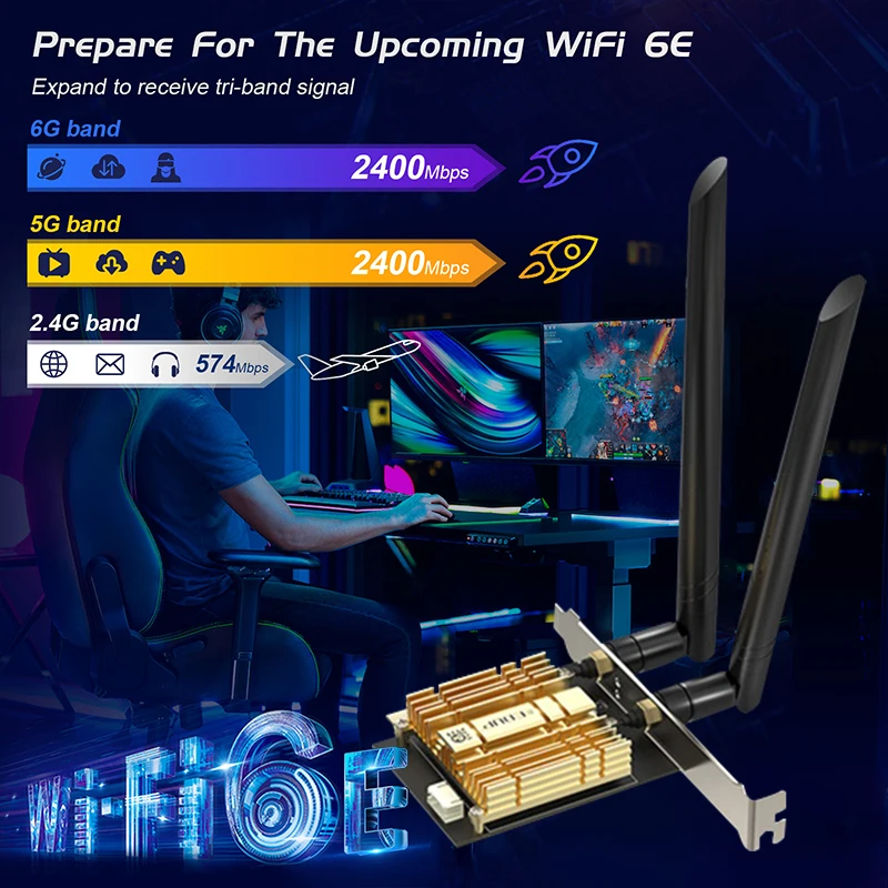 Velocidad de transmisión: 2,4G hasta 574Mbps, 5,8G hasta 2400Mbps,6G hasta 2400Mbps