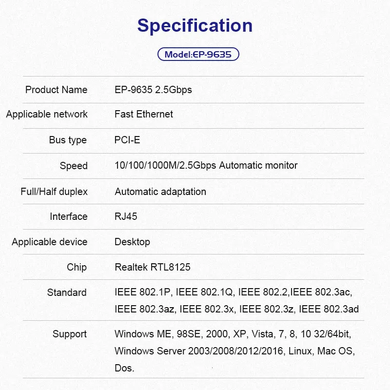 1. Proporciona conectividad Ethernet de 2,5 Gigabit a rebases Mac Pro y PC con Windows.Una forma sencilla de agregar o ampliar conectividad Ethernet de 2,5 Gigabit a cualquier computadora compatible.Es adecuado para múltiples segmentos de mercado y aplicaciones emergentes, como computadoras de escritorio, móviles, estaciones de trabajo, servidores, plataformas de comunicaciones y aplicaciones integradas. 2. Con esta tarjeta PCIe, puede agregar un puerto Ethernet de 10/100/1000/25000 Mbps a cualquier PC a través de una ranura PCIe. Se adapta a cualquier conector PCI Express x1, x2, x4, x8 o x16; El soporte adicional de perfil bajo de 8 cm proporciona la opción de instalación en carcasas HTPC de tamaño pequeño. 3. Esta tarjeta adaptadora de red Ethernet 10/100/1000/2500 de 2,5 Gigabit basada en PCI proporciona una conexión sencilla a una red Ethernet de 2,5 Gigabit y es totalmente compatible con la etiqueta LAN (VLAN) virtual 802.1Q.y tarjeta Ethernet que cumple con IEEE802.3, IEEE802.3u e IEEE802.3ab. 4. El NIC PCIe de 2,5 Gigabit de alta calidad con soporte de perfil de 12 cm y soporte de perfil adicional de 8 cm que facilita la instalación de la tarjeta en un factor de forma pequeño/servidor de computadora de perfil bajo. 5.Tarjeta de red Gigabit Compatible con una amplia gama de sistemas operativos, incluidos Windows 10, 8/8,1, 98SE, ME, 2000, XP, XP-64bit, Vista, Vista-64bit, 7, 7-64bit, Linux, macOS 10.7 6. Lo que obtienes: tarjeta de red PCI-E de 2,5 Gigabit x1, disco controlador x1, soporte de perfil bajo de 8 cm x1.Respaldado por EDUP 1 año de garantía sin complicaciones y servicio al cliente de por vida. 7.Nota importante: solo funciona con ranura PCI-E, no para ranura PCI.
