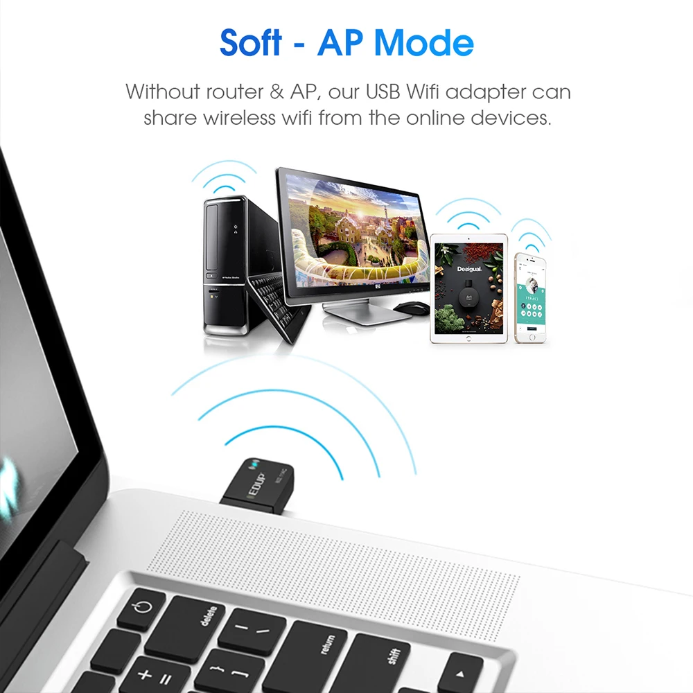 El EDUP 1800 es un adaptador inalámbrico USB 802.11Ax, adopta el Realtek8832AU y la velocidad de transferencia podría ser de Mbps. Este producto se puede utilizar para ordenadores, PSP, reproductores multimedia y otros dispositivos que necesiten aplicaciones inalámbricas. Se puede establecer como un AP durante la instalación para que pueda usarse para compartir Internet con otros dispositivos Wi-Fi. El botón WPS hace que el cifrado sea muy conveniente. Con el CD AUTO-RUN, incluso el usuario novato puede instalarlo muy fácil y rápidamente.