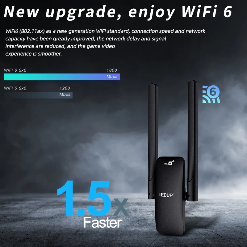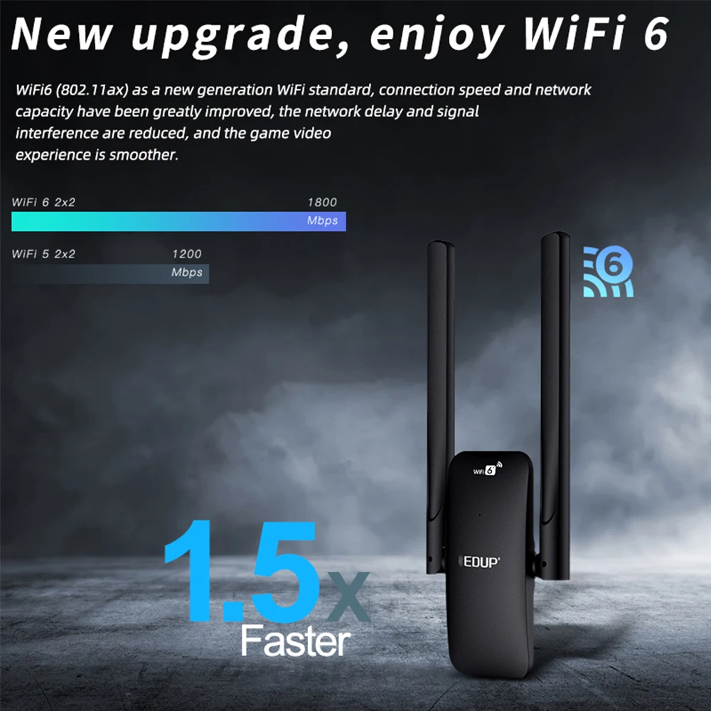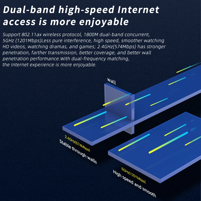 Admite protocolo inalámbrico 802.11ax, concurrente de doble banda de 1800Mbps, 5GHz (1201Mbps) Interferencia menos pura, alta velocidad, visualización de videos HD más suave, ver dramas y Juegos; 2,4 GHz(574Mbps) tiene una penetración más fuerte, una transmisión más lejana, una mejor cobertura y un mejor rendimiento de penetración de la pared. Con la combinación de Frecuencia dual, la experiencia de Internet es más agradable.