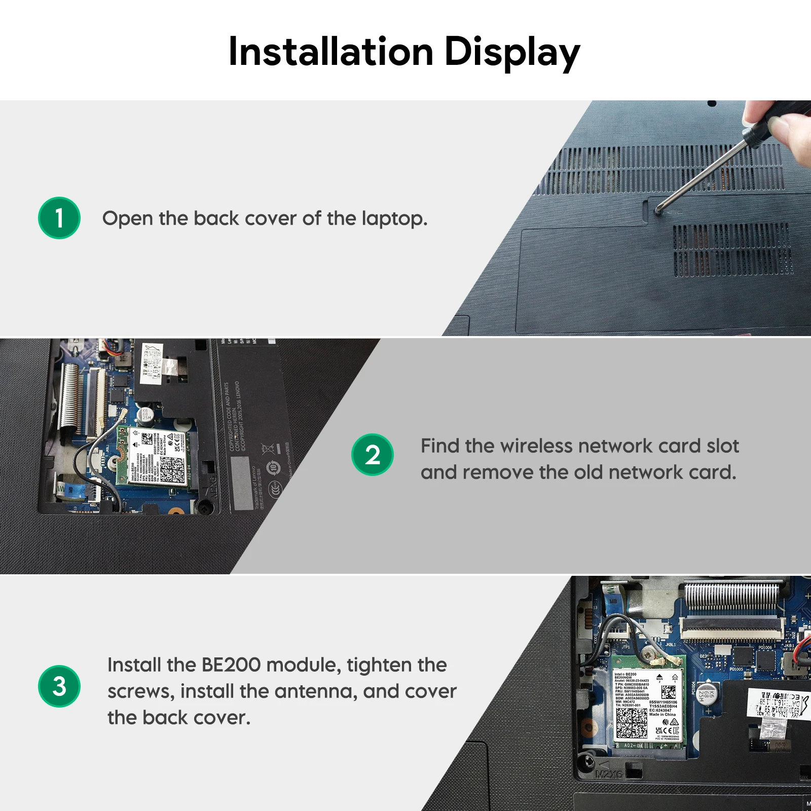 3. el módulo BE200 Instale, apriete los tornillos. Instale la antena. Y cubre la cubierta trasera.