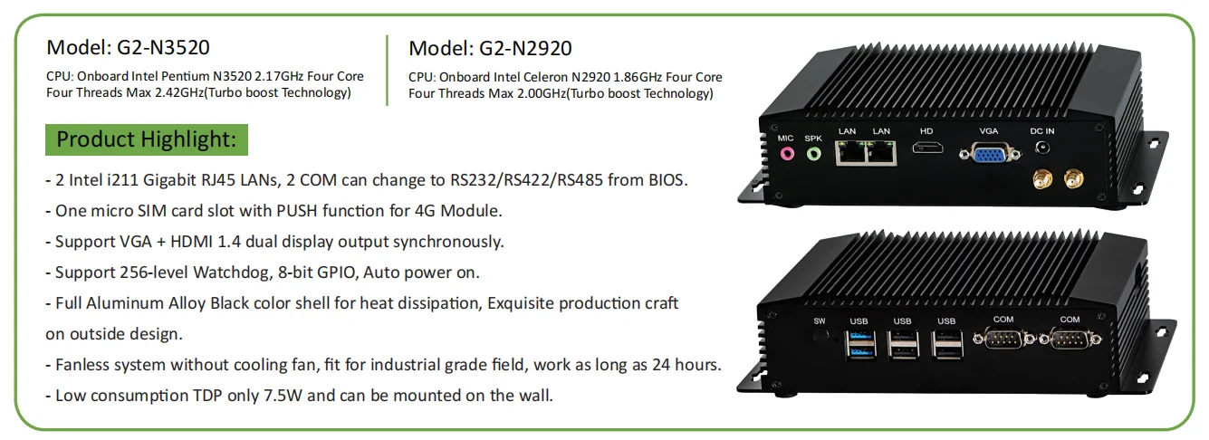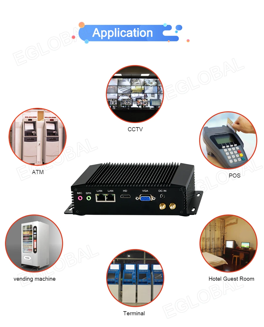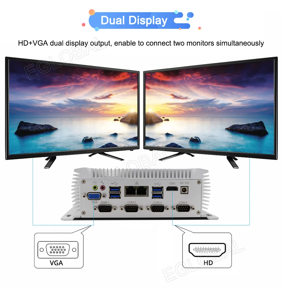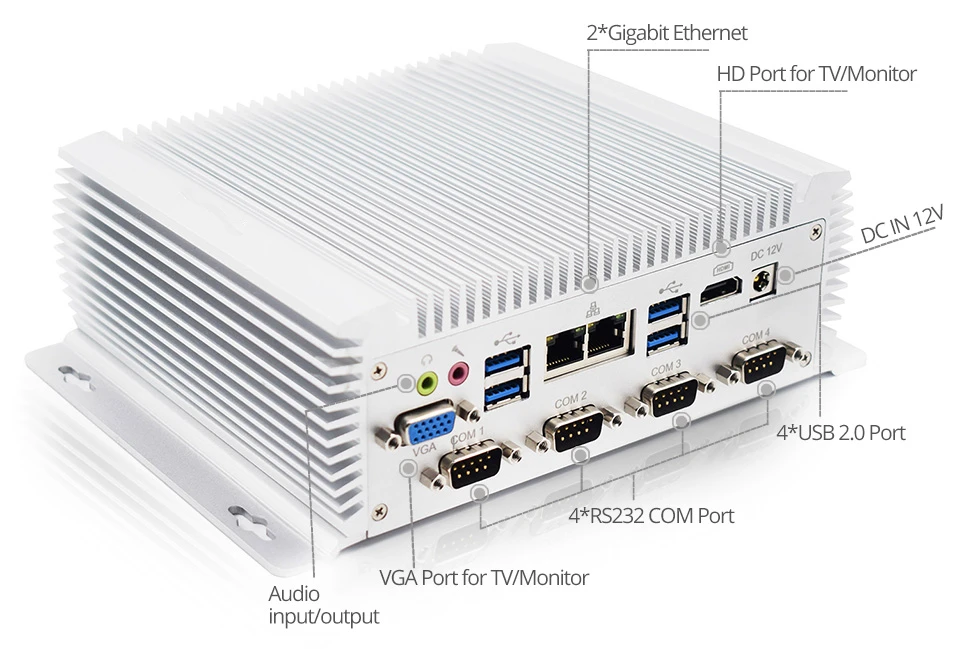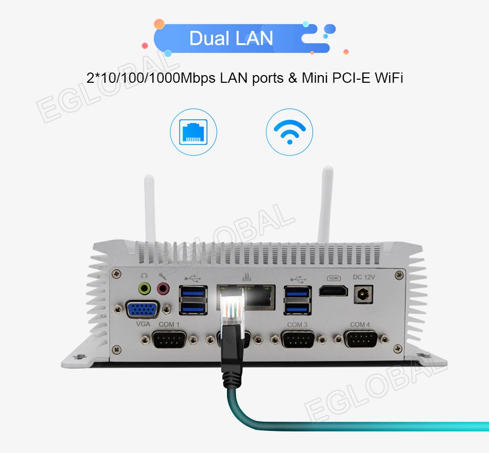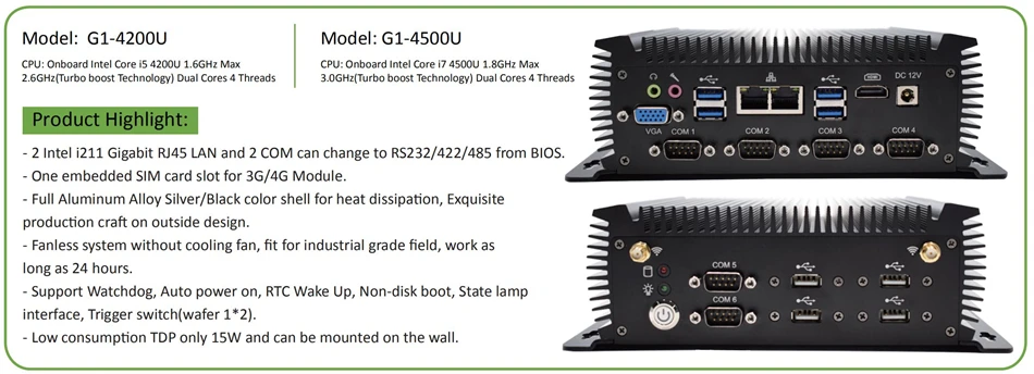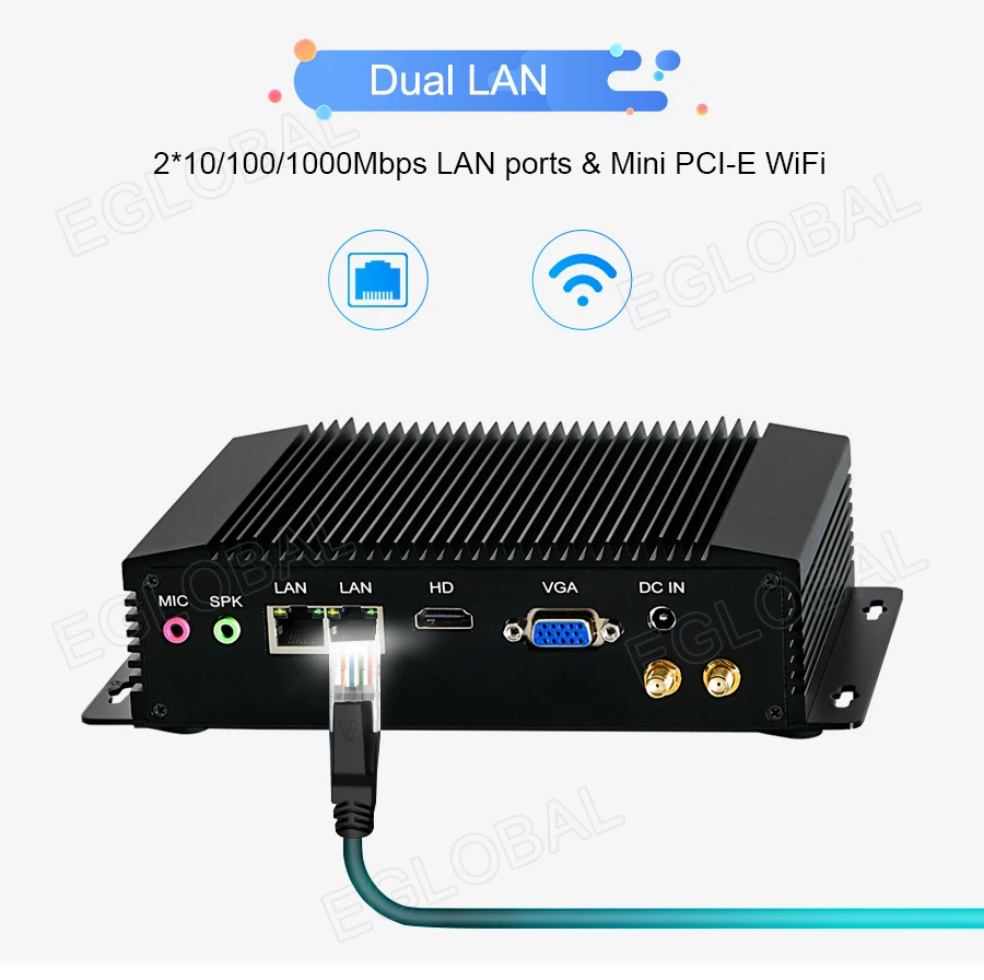 -- Dos puertos Intel i211 Gigabit Ethernet LAN, Mini PCI-E WiFi 802.11b/g/n (opcional Bluetooth), puertos serie RS232 (2x RS485/RS422 opcional), pantalla Dual HDMI y VGA,. Chasis de aluminio y enfriamiento pasivo sin ventilador y ahorro de ruido y energía Zeor, función de perro de reloj, Encendido automático, activación RTC, soporte de módulo 3G/4G y SIM Tarjeta de