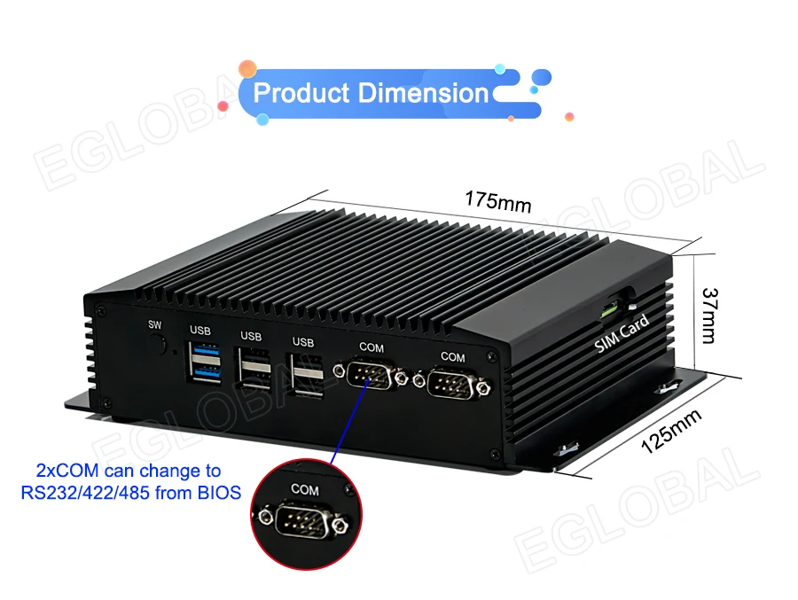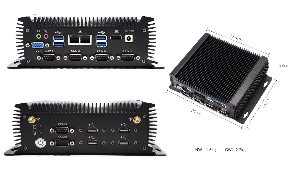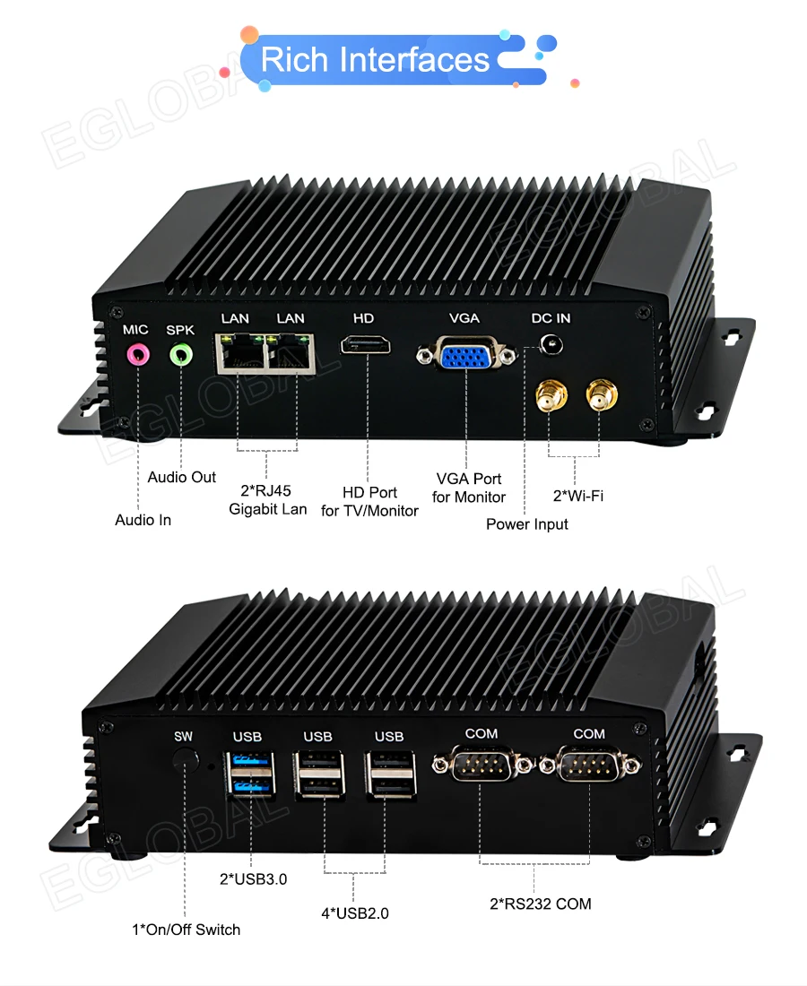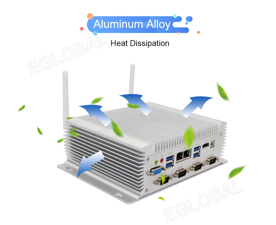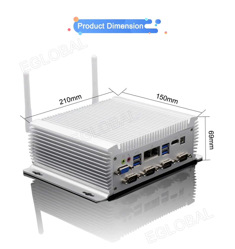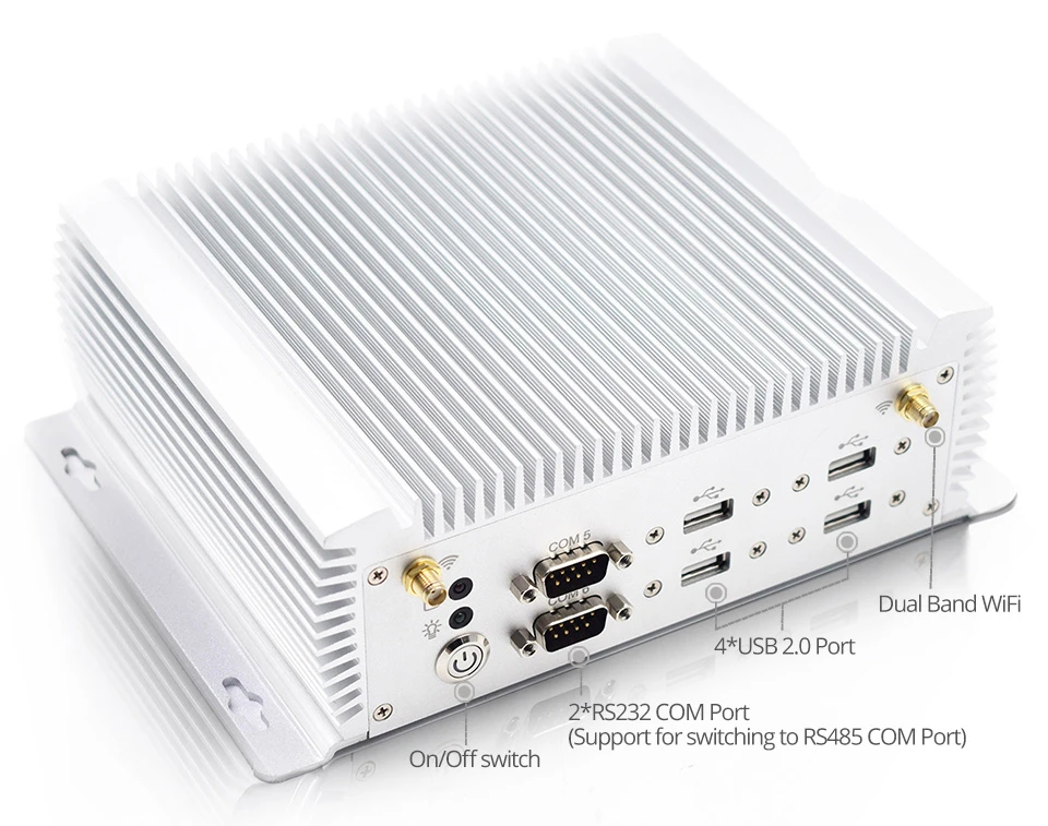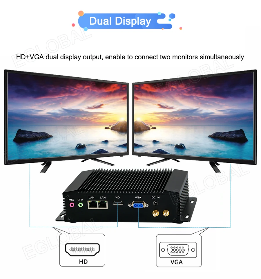 -- Dos puertos Intel i211 Gigabit Ethernet LAN, Mini PCI-E WiFi 802.11b/g/n (opcional Bluetooth), puertos serie RS232 (2x RS485/RS422 opcional), pantalla Dual HDMI y VGA,. Chasis de aluminio y enfriamiento pasivo sin ventilador y ahorro de ruido y energía Zeor, función de perro de reloj, Encendido automático, activación RTC, soporte de módulo 3G/4G y SIM Tarjeta de