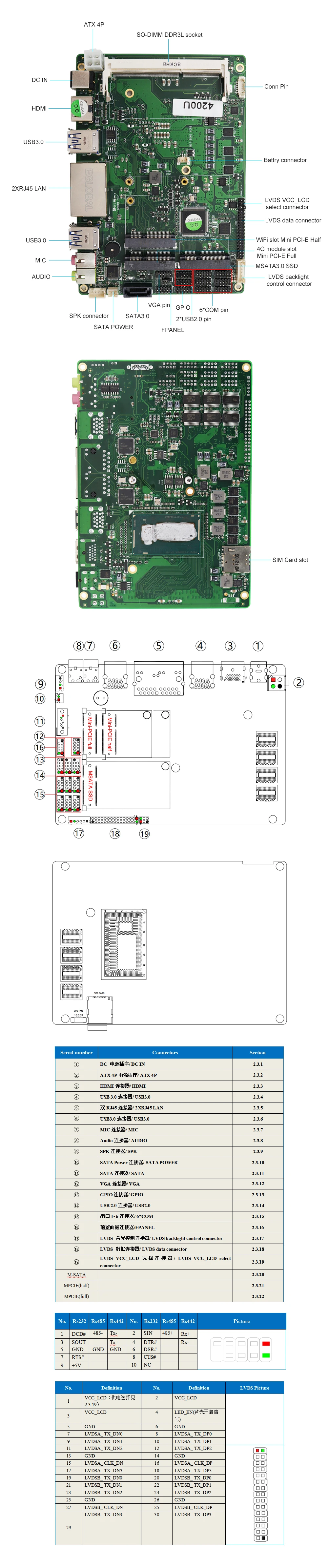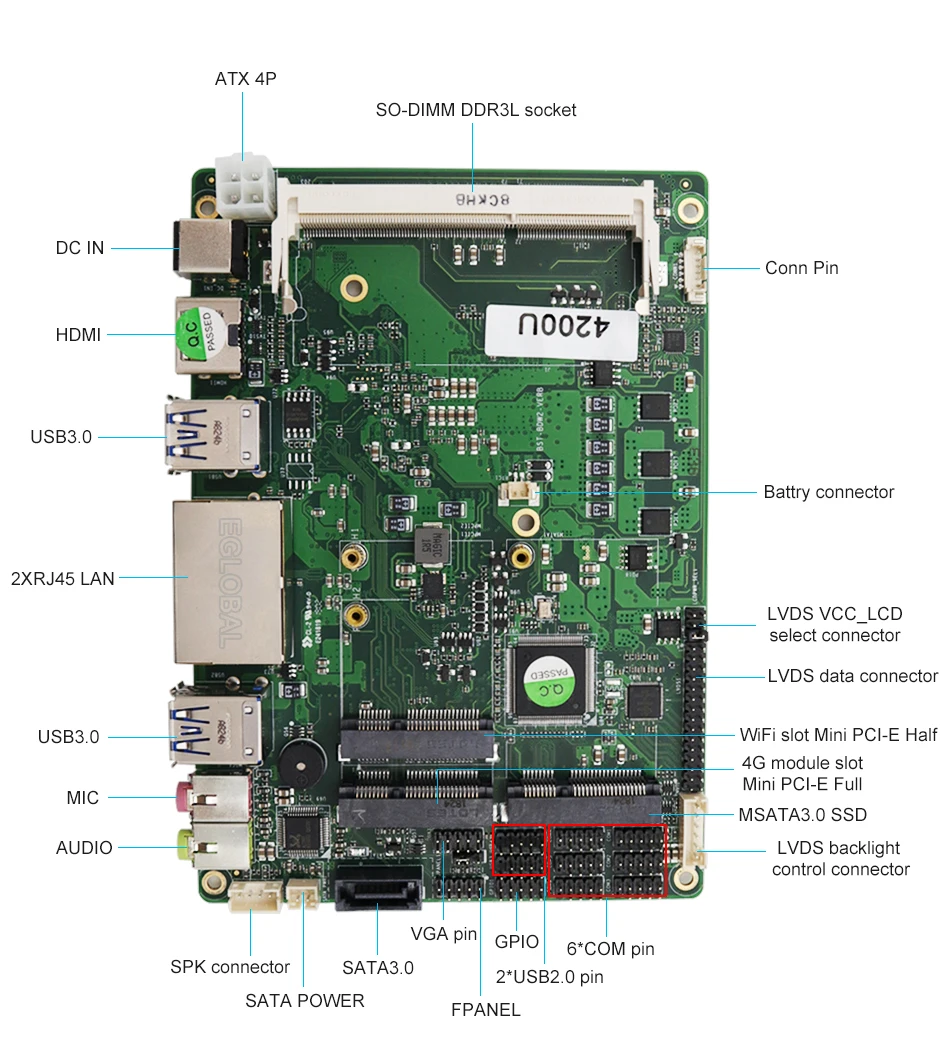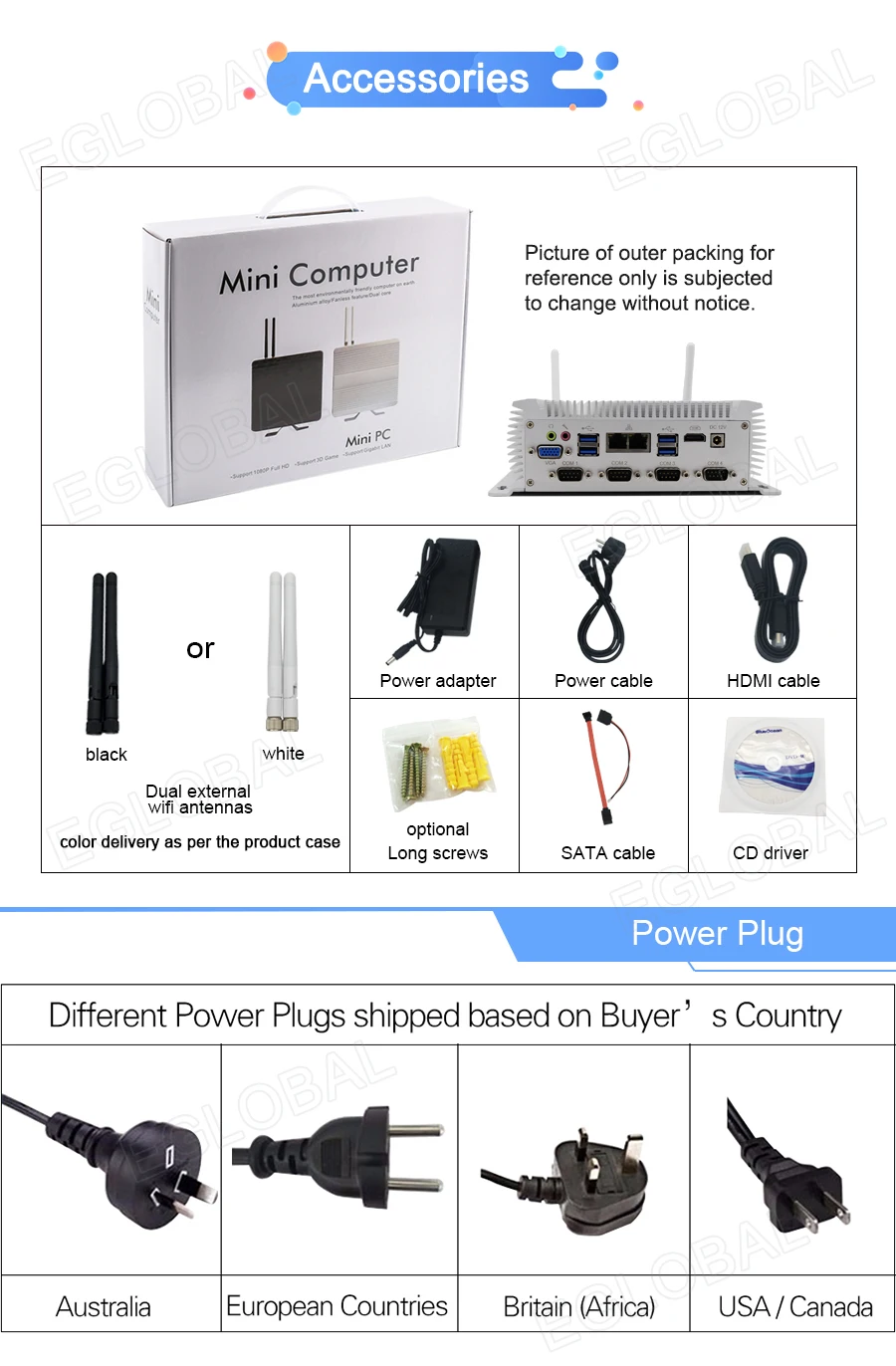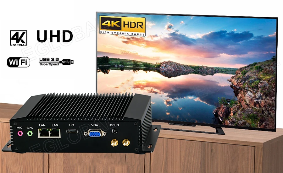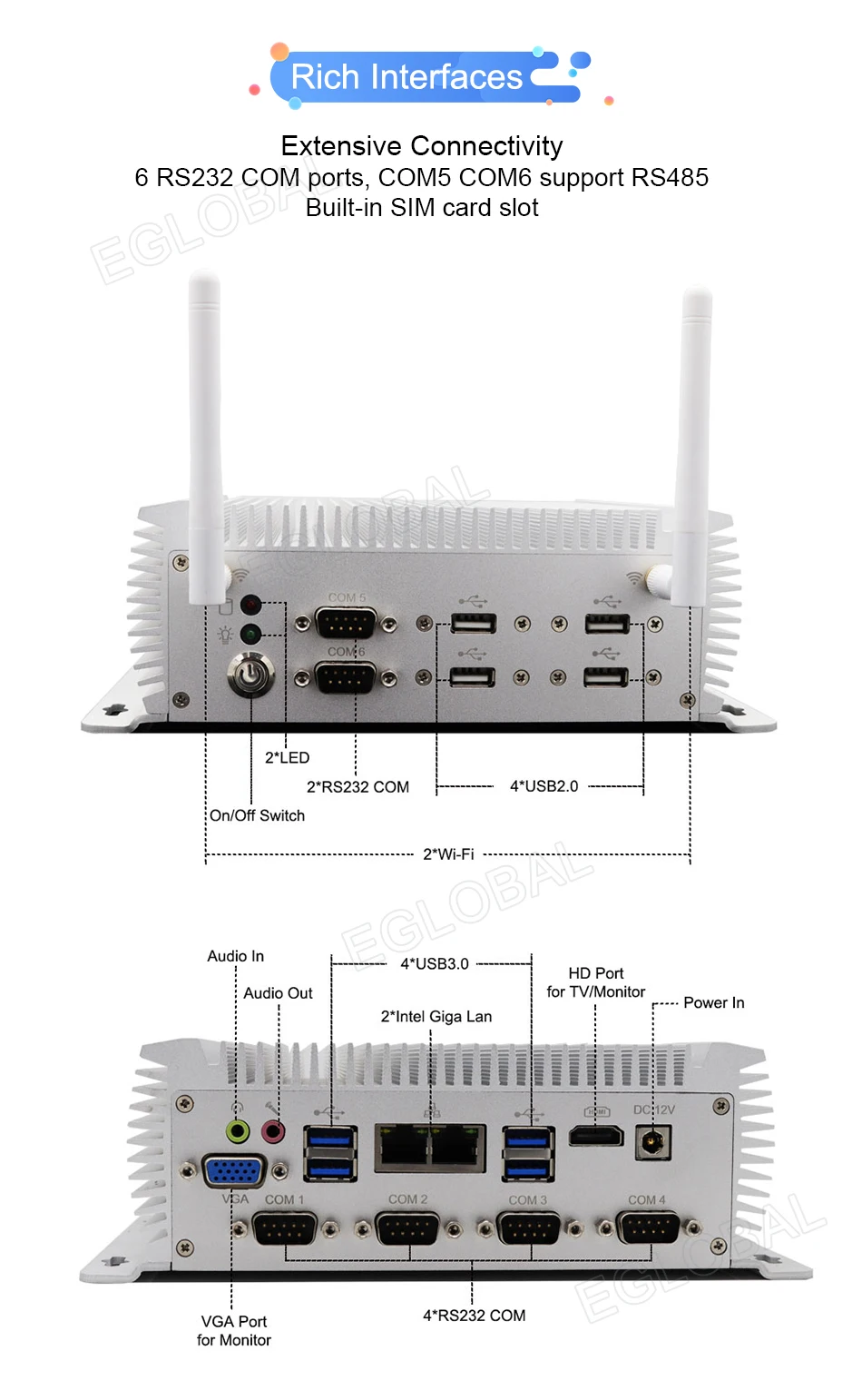 -- Dos puertos Intel i211 Gigabit Ethernet LAN, Mini PCI-E WiFi 802.11b/g/n (opcional Bluetooth), puertos serie RS232 (2x RS485/RS422 opcional), pantalla Dual HDMI y VGA,. Chasis de aluminio y enfriamiento pasivo sin ventilador y ahorro de ruido y energía Zeor, función de perro de reloj, Encendido automático, activación RTC, soporte de módulo 3G/4G y SIM Tarjeta de