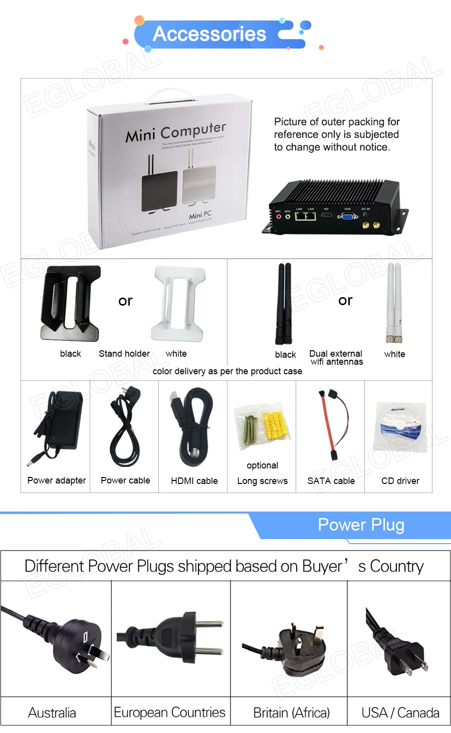 Estándar | 1x mini PC, 1x adaptador de corriente, 1x cable de alimentación, 1x bolsa de tornillos |
