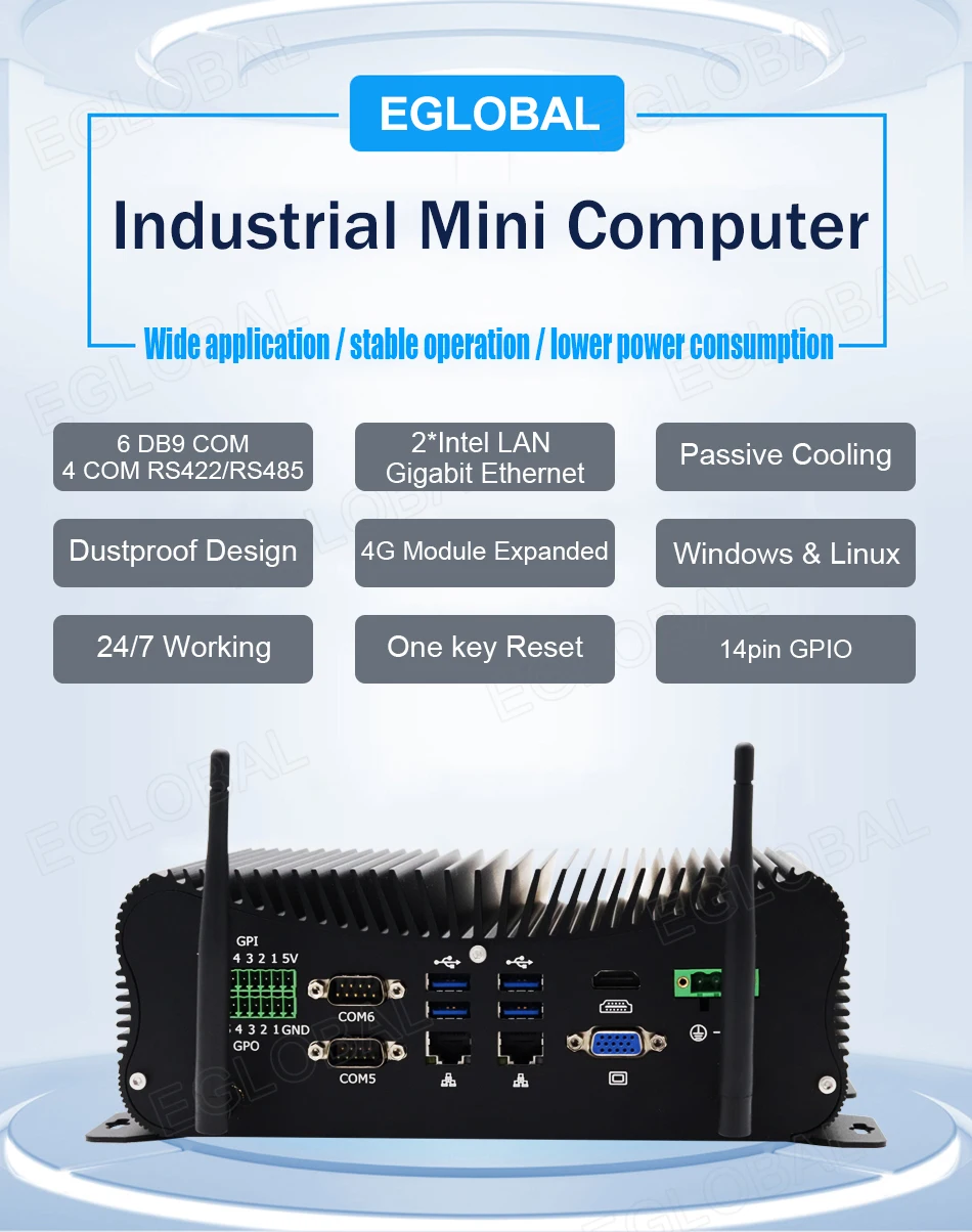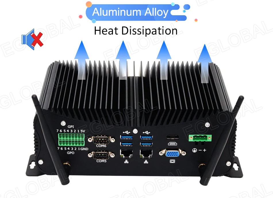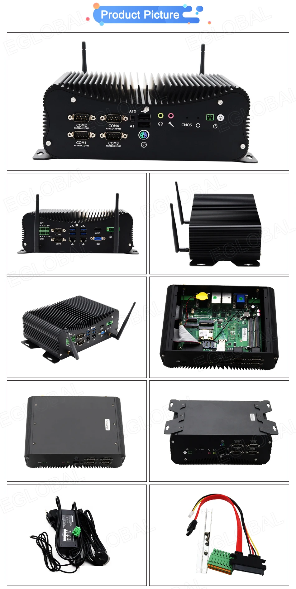 Audio1 x micrófono, 1 x SPKOtros1 x Restablecimiento, 1 x botón CMOS claro, 1 x Entrada de fuente de alimentación de terminal Phoenix de 2 pinesAlmacenamientoMSATA/M.21 ranura para SSD MSATA de, 1 ranura M.2 PARA SSD M.2 NVMeSATA1 ranura SATA3.0 para SATA HDD o SSDWi-FiMódulo1 x mini PCIE-medio puerto para módulo Wi-Fi/Bluetooth1 x mini puerto completo PCIE para módulo 3G/4G/Wi-Fi/BluetoothAntena2 x cables RF internos y 2 x antenas externasPotencia y entorno de trabajoEntradaAC/50-60HzSalidaDC + 9V ~ + 36V, recomendado 12V/5ATemperatura de funcionamiento-20/+ 60 centígradosTemperatura de almacenamiento-30/+ 70 grados centígradosHumedad almacenamiento10% ~ 90% @ 30 centígrados (sin condensación)Dimensiones y detalles del productoTamaño150*83*224mm (chasis de 248mm)PesoRed 1,3 KG, Bruto 3,5 KGCarcasaAleación de aluminio de color negro/plateado (cualquier color personalizado para pedidos a granel)Montaje4 agujeros de montaje en estucheModo enfriamientoSin ventiladorFuncionesWatchdog, AWAL, RTC, WOL (modo ATX)Contenido del paqueteEstándar1xMini PC, 1xAdaptador de corriente, 1xCable de alimentación, 1xBolsa de tornillosOpcionalAntenas Wi-Fi, 1 cable HDMI, 1 manual de usuario, 1 bolsa de tornillos larga Comprar Eglobal-Mini PC Industrial Intel Core i5, 8250U, 10210U, i7, 10510U, 2 LAN, 6 COM, GPIO, VGA, HDMI, Interfaces