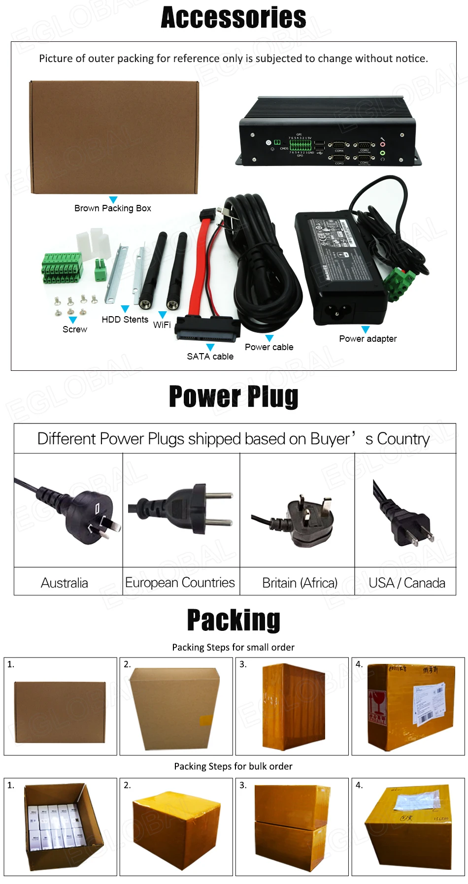 1x mini PC, 1x adaptador de corriente, 1x cable de alimentación, 1x bolsa de tornillos