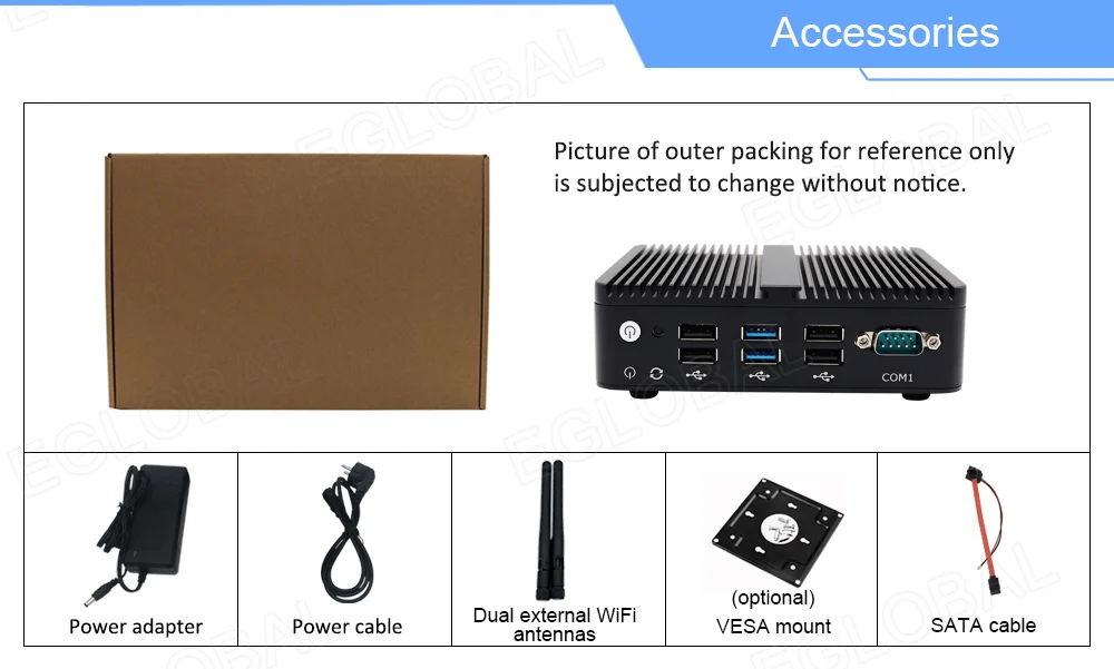 1xMini PC, 1xAdaptador de corriente, 1xCable de alimentación, 1xBolsa de tornillos