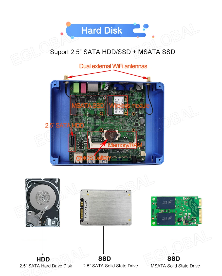 Soporta Intstall 1 * mSATA SSD y 1*2,5 pulgadas SATA HDD / SSD