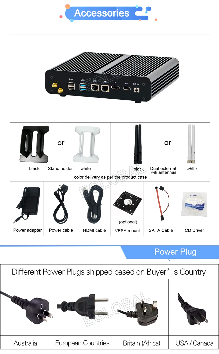 1xMini PC, 1xAdaptador de corriente, 1xCable de alimentación, 1xBolsa de tornillos, 1xSoporte