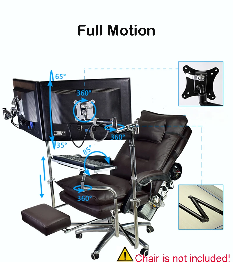 Sujeción de silla de movimiento completo, soporte de teclado de montaje de Monitor dual + alfombrilla de ratón de sujeción de brazo de silla para juegos y oficina