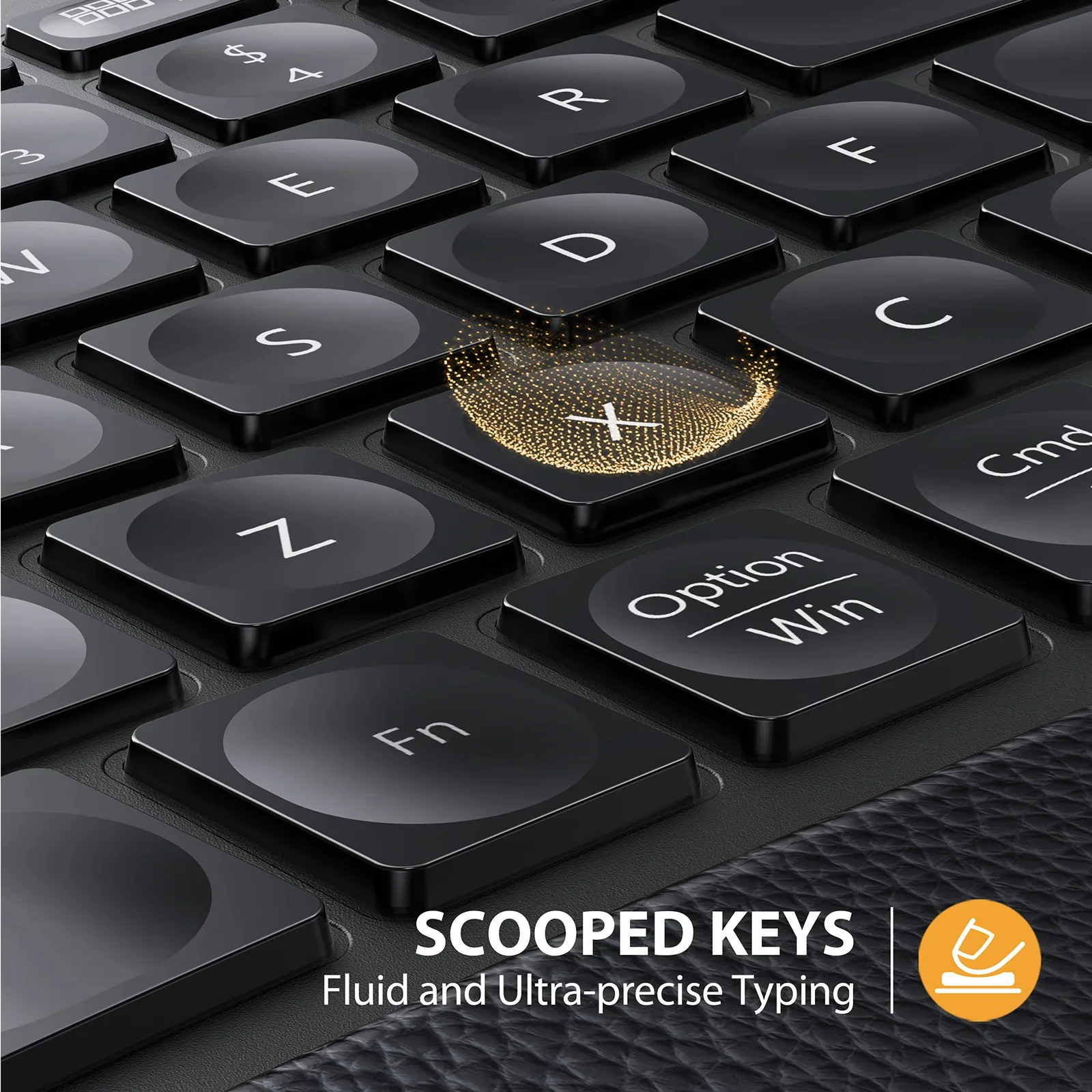 【Escritura silenciosa y comoda】 La Estructura del interruptor de tijera hace que cada pulsación de tecla sea silenciosa y de rebote rápido, las teclas recogidas coinciden con la forma de las puntas de los dedos, ofreciendo una experiencia de escritura rápida y precisa. Las patas inclinadas de diseño ergonómico levantan el teclado en un ángulo perfecto para mantener la muñeca cómoda y relajada, ya sea sentada o de pie.