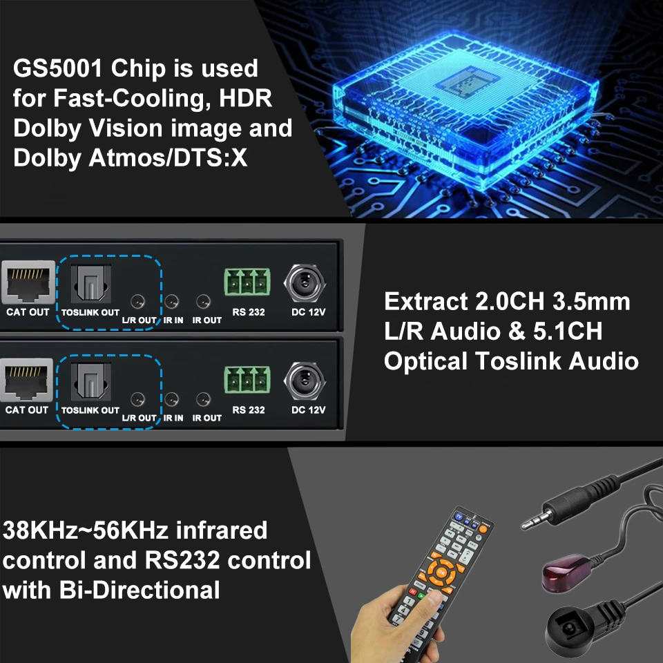 También admite audio integrado para Toslink y salida de audio L/R y función POC. Además, el extensor está equipado con paso IR bidireccional que permite el control de la fuente y la pantalla.