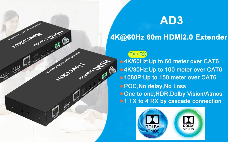 Transmite video HDMI y audio 4K @ 60Hz señal hasta 60m,4K @ 30Hz señal hasta 100M