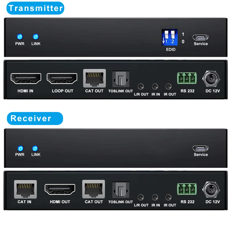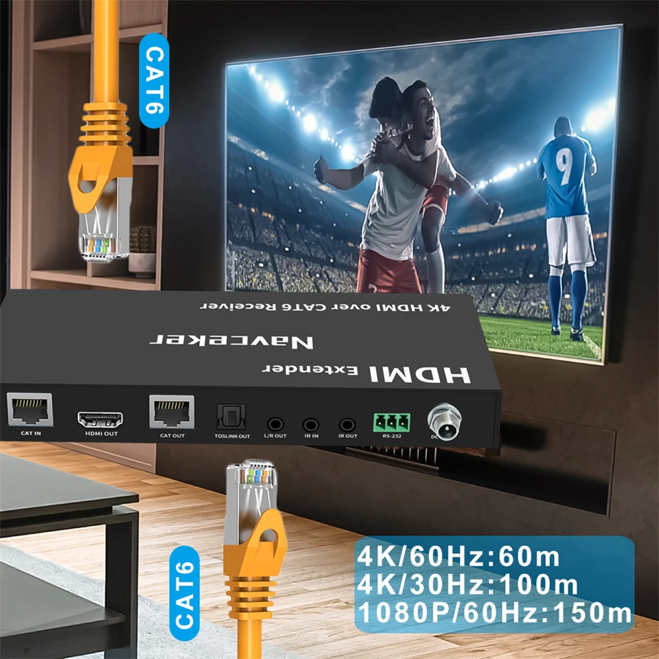 El extensor HDMI Navceker de 18Gbps puede extender la señal de video / audio de alta definición, el Toslink óptico, el conector de 3,5mm y el IR bidireccional, por el momento, por el momento. Y la distancia es de hasta 400 pies/120 metros entre el transmisor y el receptor a través de un solo cable CAT6.
