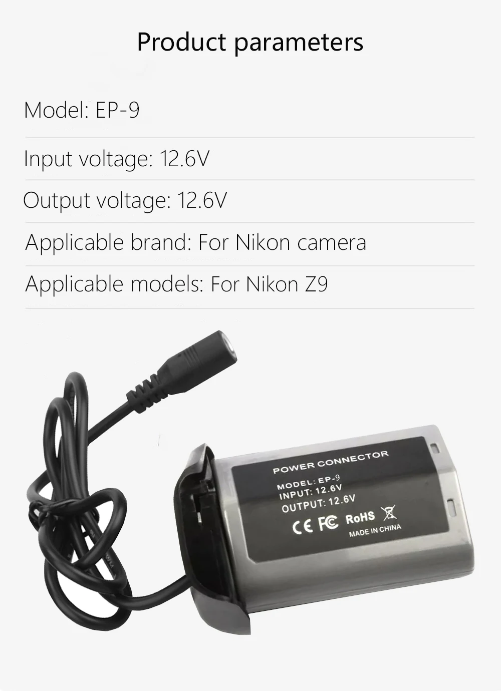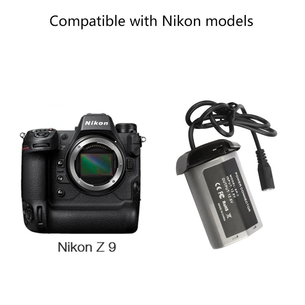 Adaptador de corriente:Voltaje de entrada: 100-240 V ~ 50/60 HzVoltaje de salida: 12V=3ABatería simulada EP-9 EN-EL18d:Voltaje de entrada: 12,6 VVoltaje de salida: 12,6 VBatería compatible:Para Nikon EN-EL18DCompatible con el modelo de cámara:Para Nikon Z9 D5 D4 D4SSi no está seguro de la compatibilidad, comuníquese con el servicio de atención al cliente de Probty para obtener más información.La batería ficticia puede reemplazar la batería Canon, el adaptador de corriente proporciona continuamente energía ilimitada alcámara a través de la toma de CA, no es necesario reemplazar la batería, para completar fotografías de estudio a largo plazo,Grabación de video o conexión a PC, TV, videograbador, terminal para videoconferencias en líneay escenarios más aplicables.El paquete incluye:1 adaptador de corriente CA.1 cable de CA de enchufe.1 batería simulada EN-EL18D.