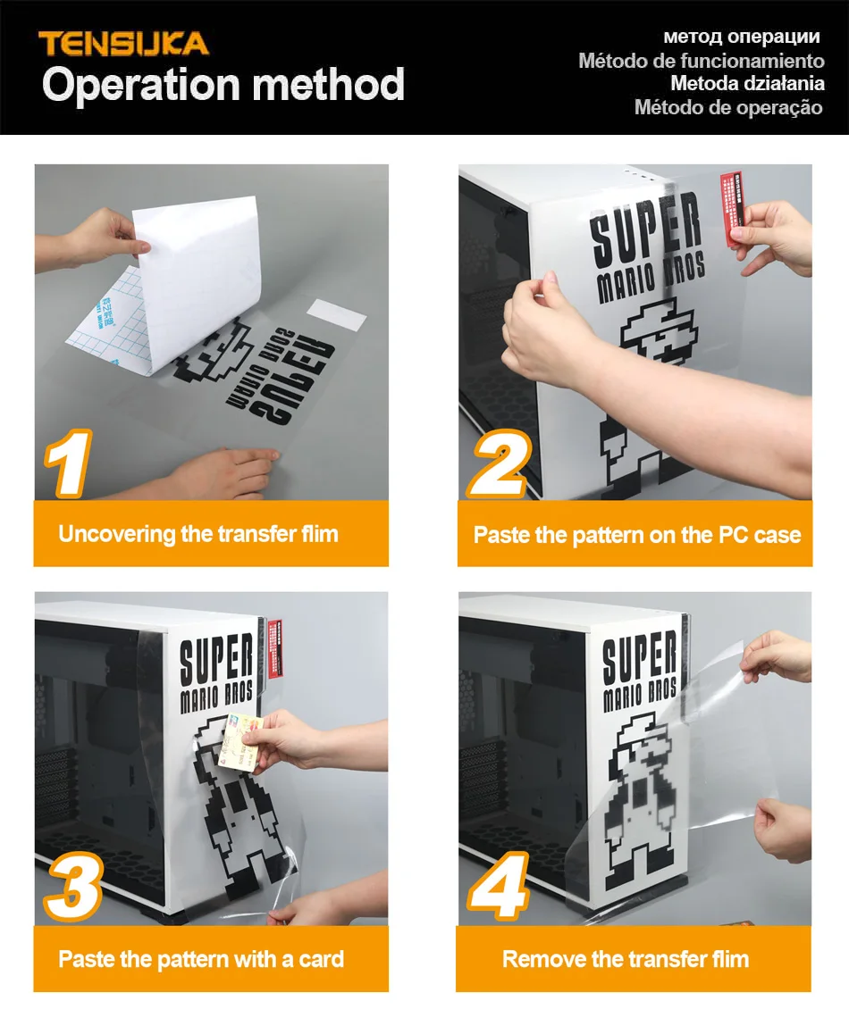 4. Este producto incluye una pegatina de patrón frontal, una pegatina de vidrio lateral y una pegatina de texto. Seleccione la pegatina adecuada para el color de su funda de PC de acuerdo con la ilustración