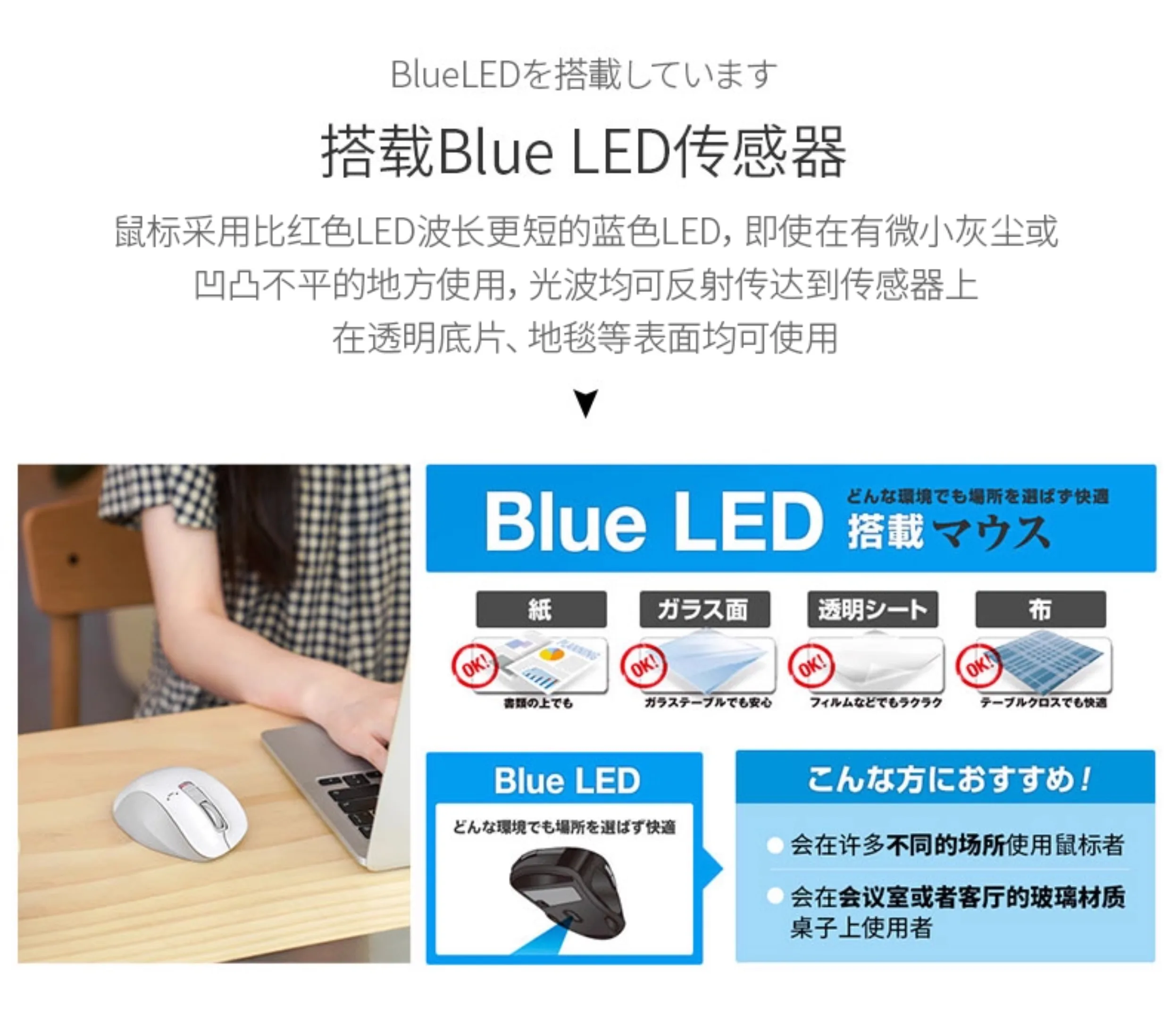 8.Equipado con un sensor LED azul, el mouse utiliza un LED azul con una longitud de onda más corta que el LED rojo.Incluso cuando se utilizan en áreas con poco polvo o desniveles, las ondas de luz pueden reflejarse y transmitirse al sensor.Se puede utilizar en sustratos transparentes, alfombras y otras superficies.
