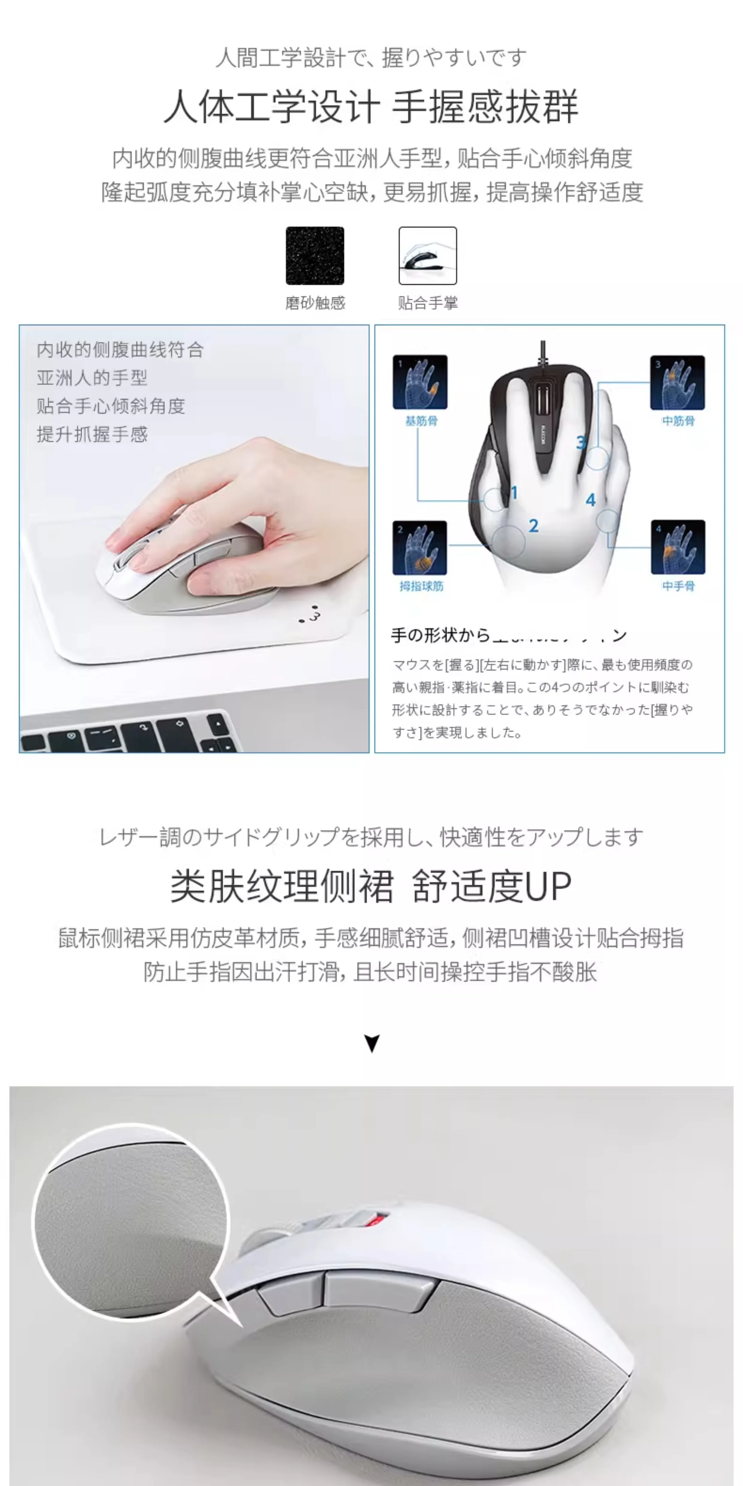 2.Falda lateral con textura similar a la piel, comodidad UP, falda lateral para mouse hecha de material de imitación de cuero, delicada y cómoda al tacto, el diseño de ranura de la falda lateral se ajusta perfectamente al pulgar para evitar que los dedos se resbalen debido al sudor, y la manipulación prolongada de los dedos no causa dolor o hinchazón