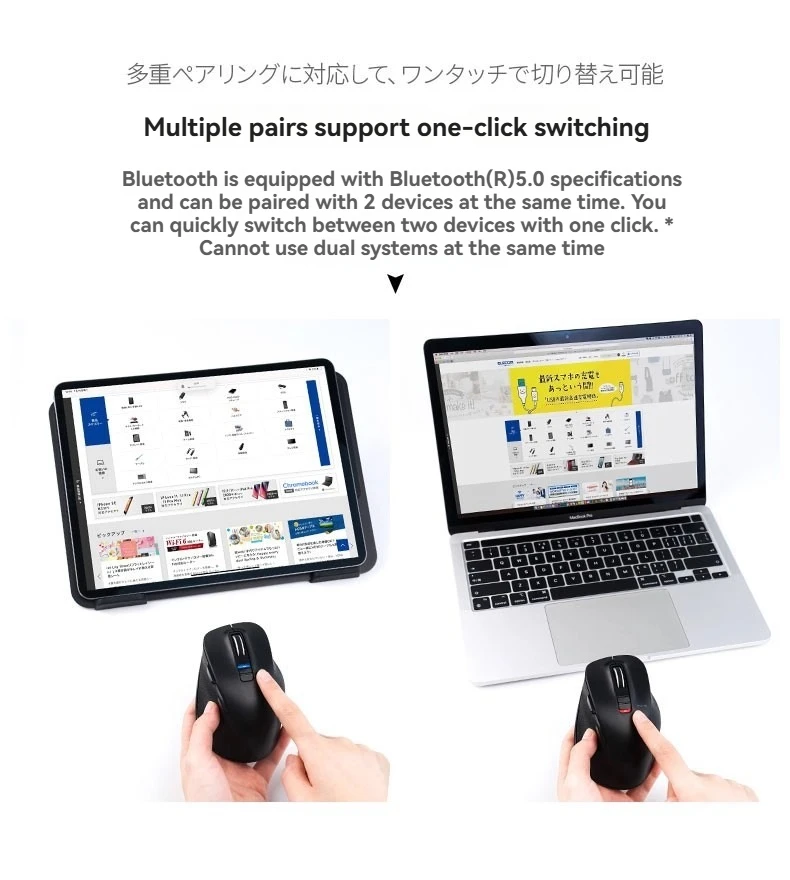 4. El emparejamiento múltiple admite el cambio con un solo clic.El modelo Bluetooth está equipado con especificaciones Bluetooth (R) 5.0 y puede emparejar 2 dispositivos al mismo tiempo.Con solo presionar suavemente, puedes cambiar rápidamente entre los 2 dispositivos.* Los sistemas duales no pueden utilizarse simultáneamente.