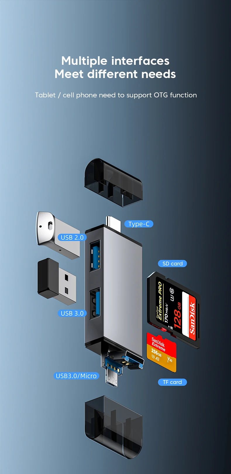 Interfaz: Micro/USB/USB2.0 + 3,0/Ranura para tarjeta de memoria: ranura para tarjeta SD + ranura para tarjeta TFMaterial de la Caja: aleación de aluminio.Color: GrisPeso: 30gFunción:Conectar al móvil 1 Notebook/Interfaz USB de expansión síncrona,Conectar dispositivos externos para leer elContenido de la tarjeta de memoria